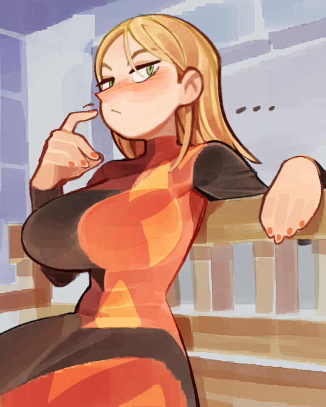 ... 1girl bench blonde_hair blush breasts fingernails green_eyes hilling_(ousama_ranking) large_breasts long_hair mature_female nail_polish ousama_ranking pointy_nose solo wamudraws