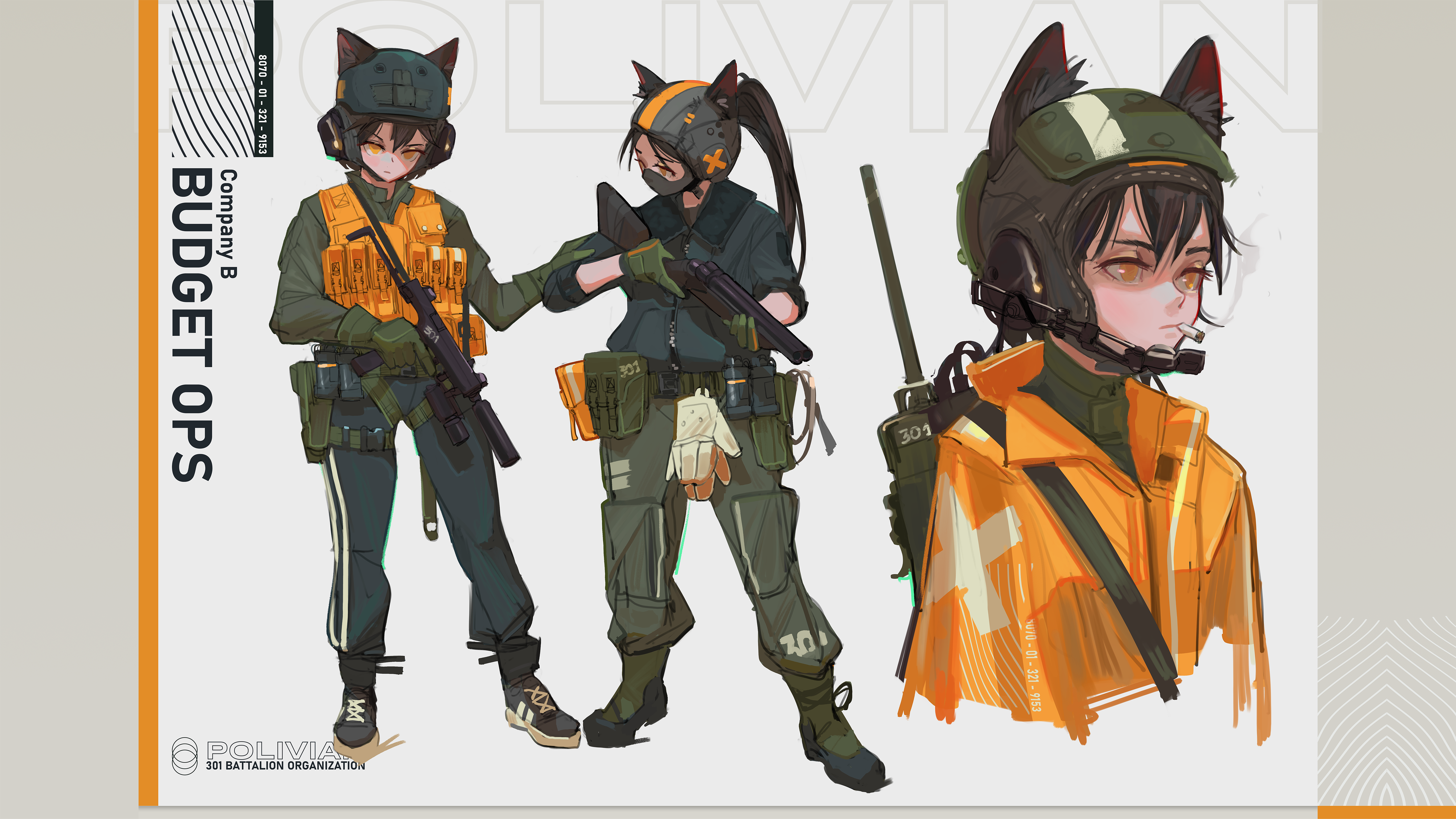 2girls absurdres ammunition_pouch animal_ears b&t_mp9 black_hair bulletproof_vest cat_ears cigarette stun_grenade gloves gun hand_on_arm handgun headset helmet highres laser_sight military_combat_uniform military_uniform multiple_girls original pants polilla ponytail pouch radio sawed-off_shotgun shoes short_hair shotgun smoke smoking sneakers submachine_gun suppressor track_pants trigger_discipline weapon