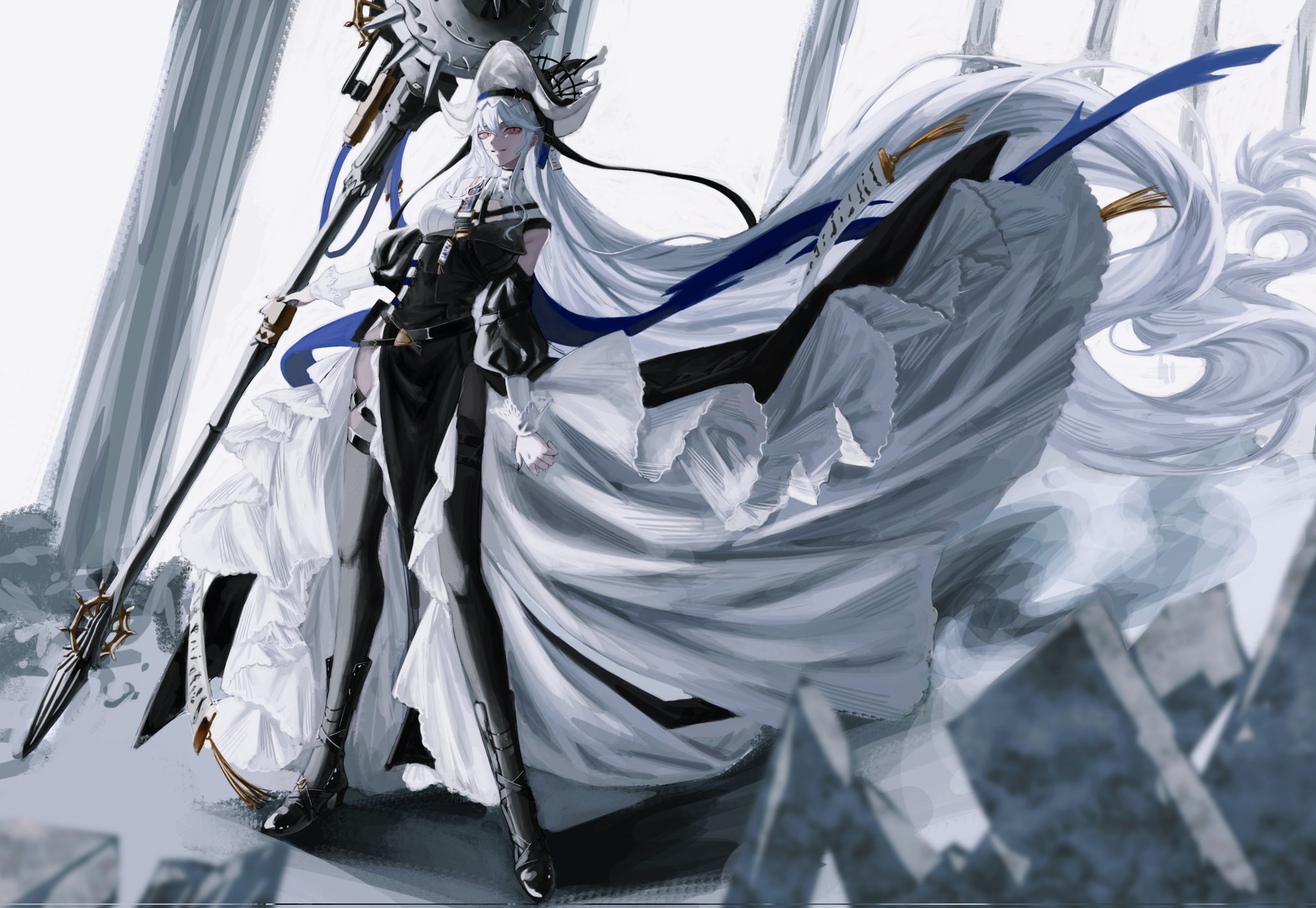 1girl arknights bare_shoulders black_boots black_dress black_nails black_pantyhose boots circular_saw clothing_cutout dress fingernails floating_hair full_body hat highres holding holding_weapon long_hair long_sleeves looking_at_viewer nail_polish nate71762013 pantyhose red_eyes saw shoulder_cutout sketch smile solo specter_(arknights) specter_the_unchained_(arknights) standing two-tone_dress very_long_hair weapon white_dress white_hair