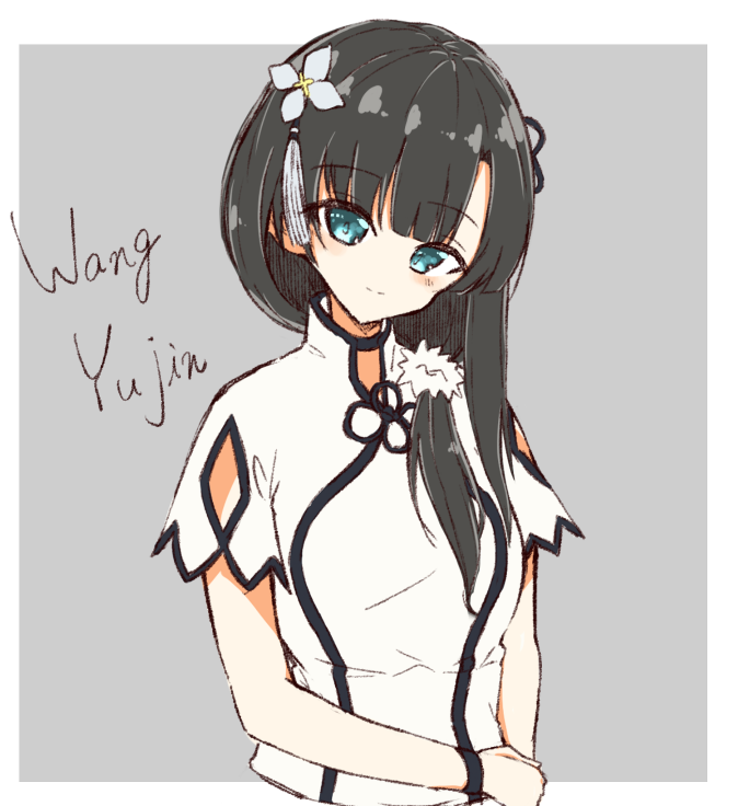 1girl aqua_eyes arm_at_side arm_cutout assault_lily black_choker black_hair blunt_bangs border character_name choker clothing_cutout cropped_arms cropped_torso flower flower_knot grey_background hair_flower hair_ornament hair_scrunchie hand_on_own_arm head_tilt light_blush light_smile long_hair looking_at_viewer low_ponytail low_side_ponytail outside_border ponytail sabtama111 scrunchie shirt short_sleeves side_ponytail simple_background solo tassel tassel_hair_ornament upper_body wang_yujia white_border white_flower white_scrunchie white_shirt wristband