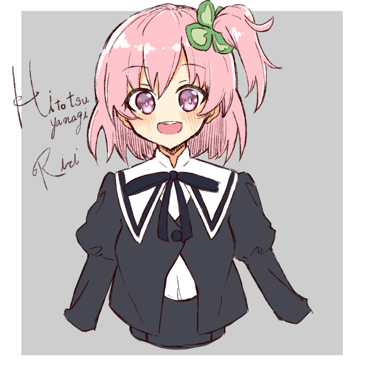 1girl :d arms_at_sides assault_lily black_ribbon black_skirt blush border buttons character_name clover_hair_ornament cropped_arms cropped_jacket cropped_torso four-leaf_clover_hair_ornament grey_background hair_ornament high-waist_skirt hitotsuyanagi_riri juliet_sleeves long_sleeves looking_at_viewer neck_ribbon one_side_up open_mouth outside_border pink_eyes pink_hair puffy_sleeves ribbon sabtama111 school_uniform shirt short_hair simple_background skirt smile solo teeth upper_body upper_teeth_only white_border white_shirt yurigaoka_girls_academy_school_uniform