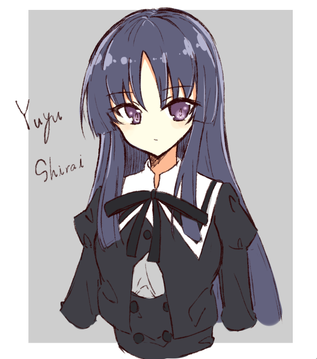 1girl arms_at_sides assault_lily black_hair black_ribbon black_skirt border buttons character_name closed_mouth cropped_arms cropped_jacket cropped_torso grey_background hair_between_eyes high-waist_skirt juliet_sleeves light_blush long_hair long_sleeves looking_at_viewer neck_ribbon outside_border puffy_sleeves purple_eyes ribbon sabtama111 school_uniform shirai_yuyu shirt sidelocks simple_background skirt solo upper_body very_long_hair white_border white_shirt yurigaoka_girls_academy_school_uniform