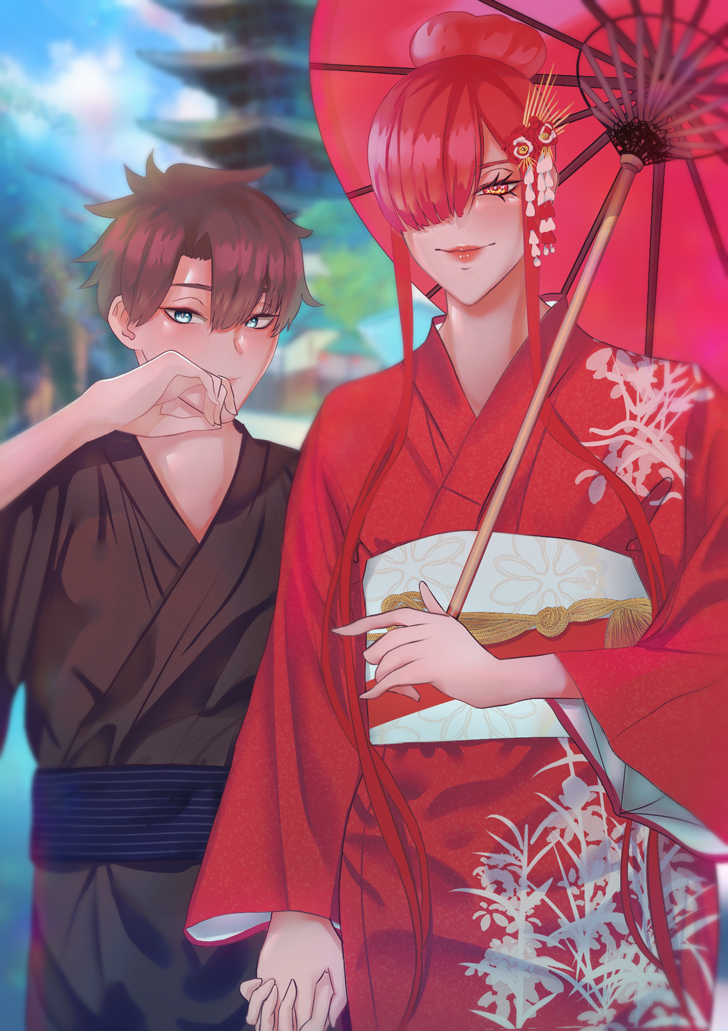 1boy 1girl blue_eyes blurry blurry_background brown_hair brown_kimono covering_own_mouth fate/grand_order fate_(series) floral_print fujimaru_ritsuka_(male) hair_bun hair_over_one_eye hand_over_own_mouth hetero highres holding holding_hands holding_umbrella interlocked_fingers japanese_clothes kimono long_hair looking_at_viewer oda_nobunaga_(fate) oda_nobunaga_(koha-ace) oda_nobunaga_(maou_avenger)_(fate) oil-paper_umbrella red_eyes red_kimono red_lips short_hair smile sundaeqi_(akisenpai9999) umbrella wwkp_(akisenpai9999) yukata