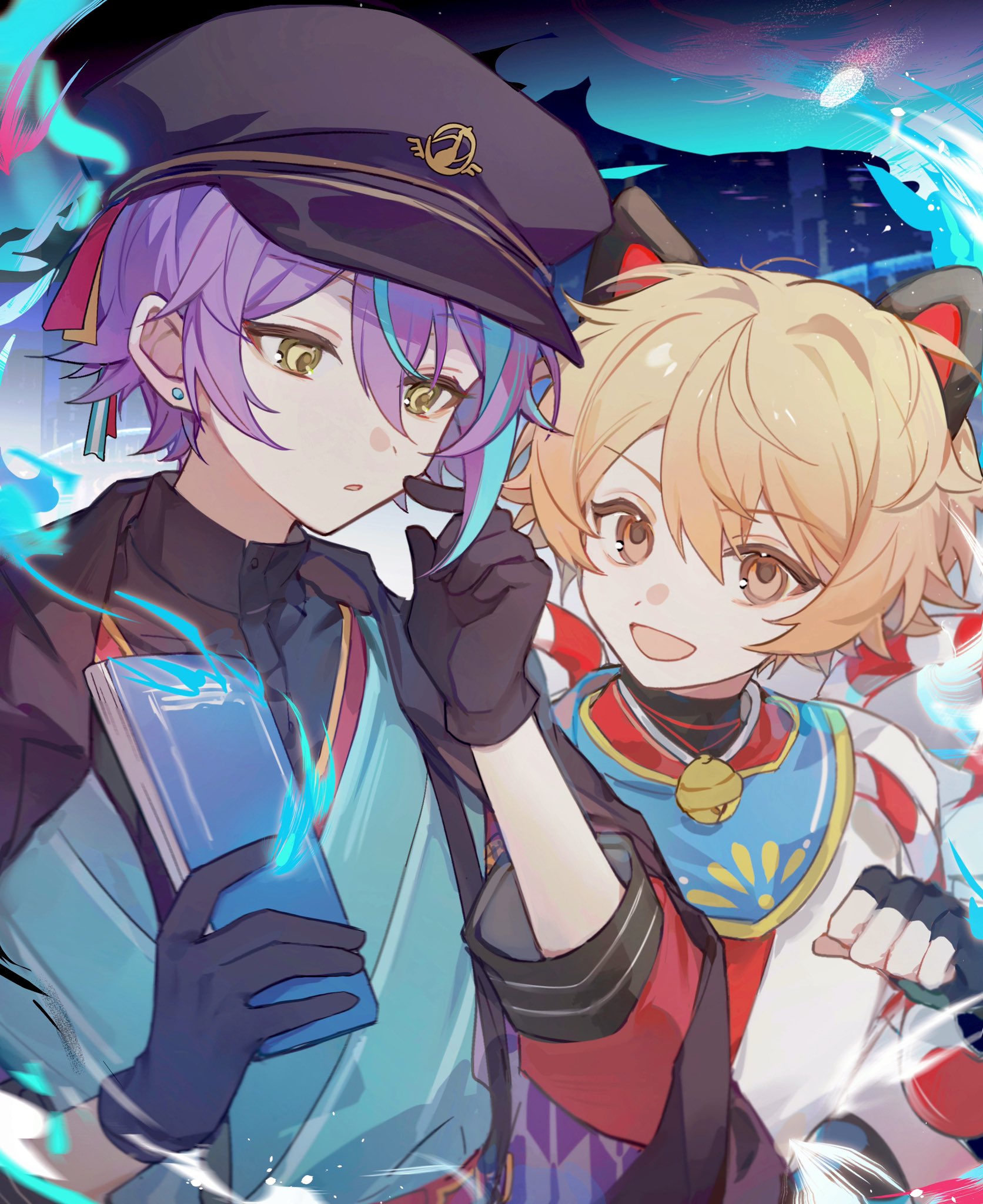 2boys animal_ears bell black_cape black_gloves black_headwear black_shirt blonde_hair blue_kimono blue_scarf newsboy_cap cape commentary_request dog_ears ear_piercing fingerless_gloves gloves hat highres hisakawa_sora japanese_clothes jingle_bell kaminoshi_(project_sekai) kamishiro_rui kimono male_focus multicolored_hair multiple_boys neck_bell paw_pose piercing project_sekai purple_hair rope scarf shimenawa shirt streaked_hair taishou tenma_tsukasa upper_body white_kimono yellow_eyes