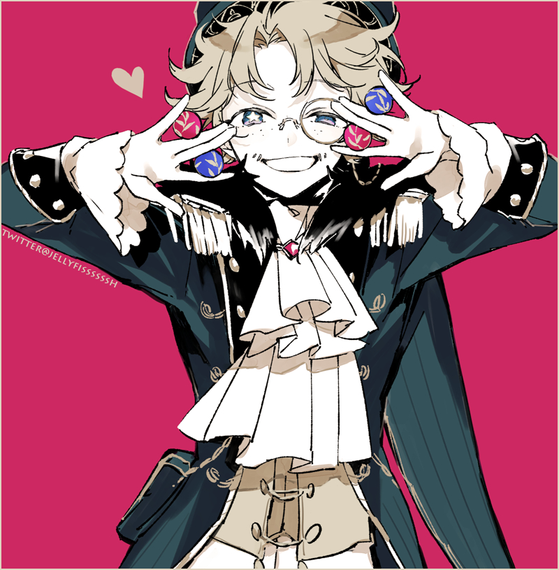 \||/ ascot ball blonde_hair blue_eyes bright_pupils double_\||/ epaulettes freckles frilled_sleeves frills fur_trim hat heart identity_v jellyfisssh kurage_ichi male_focus mike_morton mike_morton_(mr._swifts) mismatched_pupils monocle official_alternate_costume pale_skin pink_background short_hair simple_background smile solo star-shaped_pupils star_(symbol) symbol-shaped_pupils twitter_username white_ascot white_pupils ||/