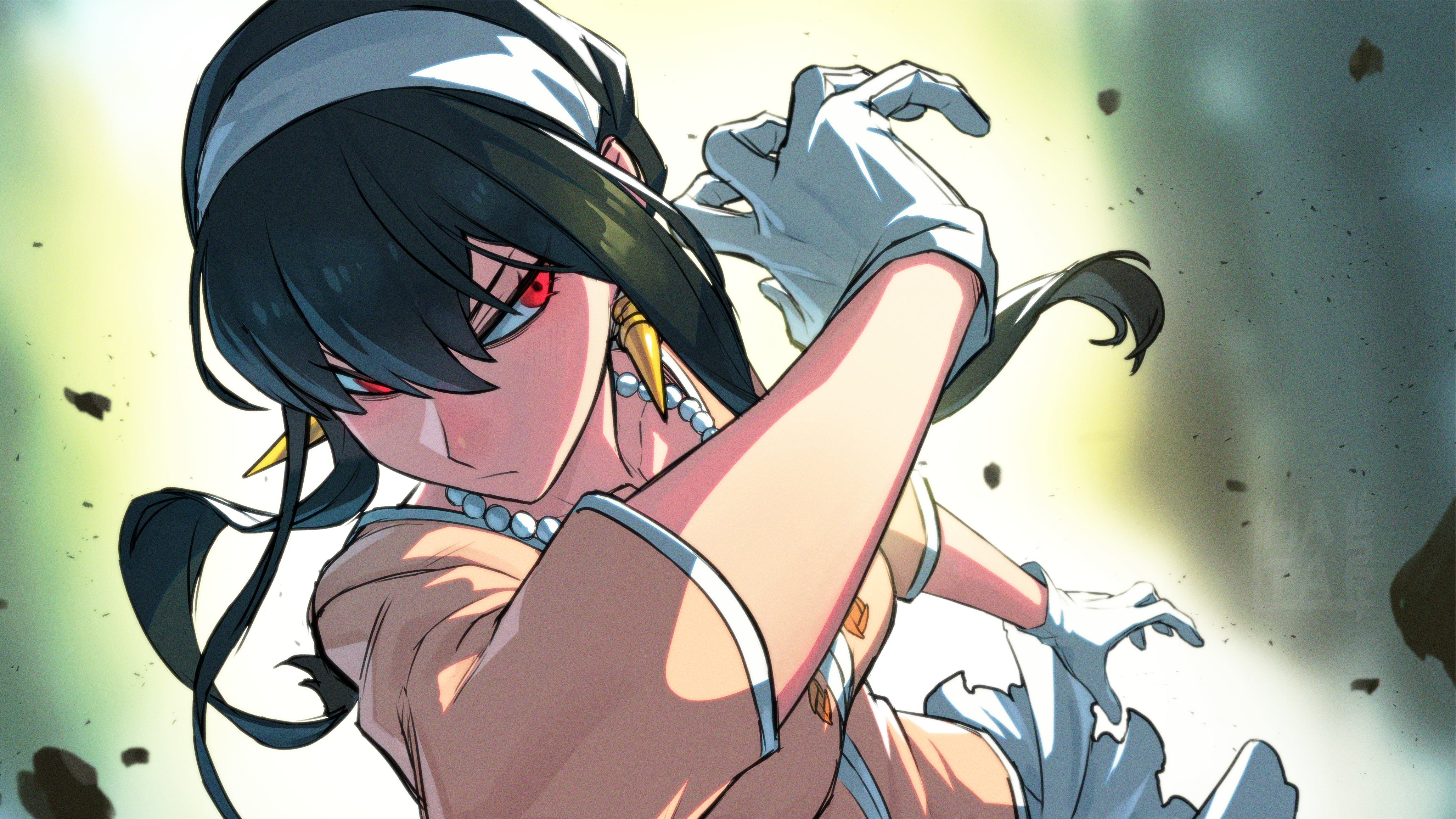 1girl absurdres black_hair covering_face earrings frown gloves gold_earrings hair_between_eyes hairband hata4564 highres jacket jewelry necklace pearl_necklace red_eyes short_hair_with_long_locks sidelocks signature skirt solo spy_x_family white_gloves white_hairband white_skirt yor_briar