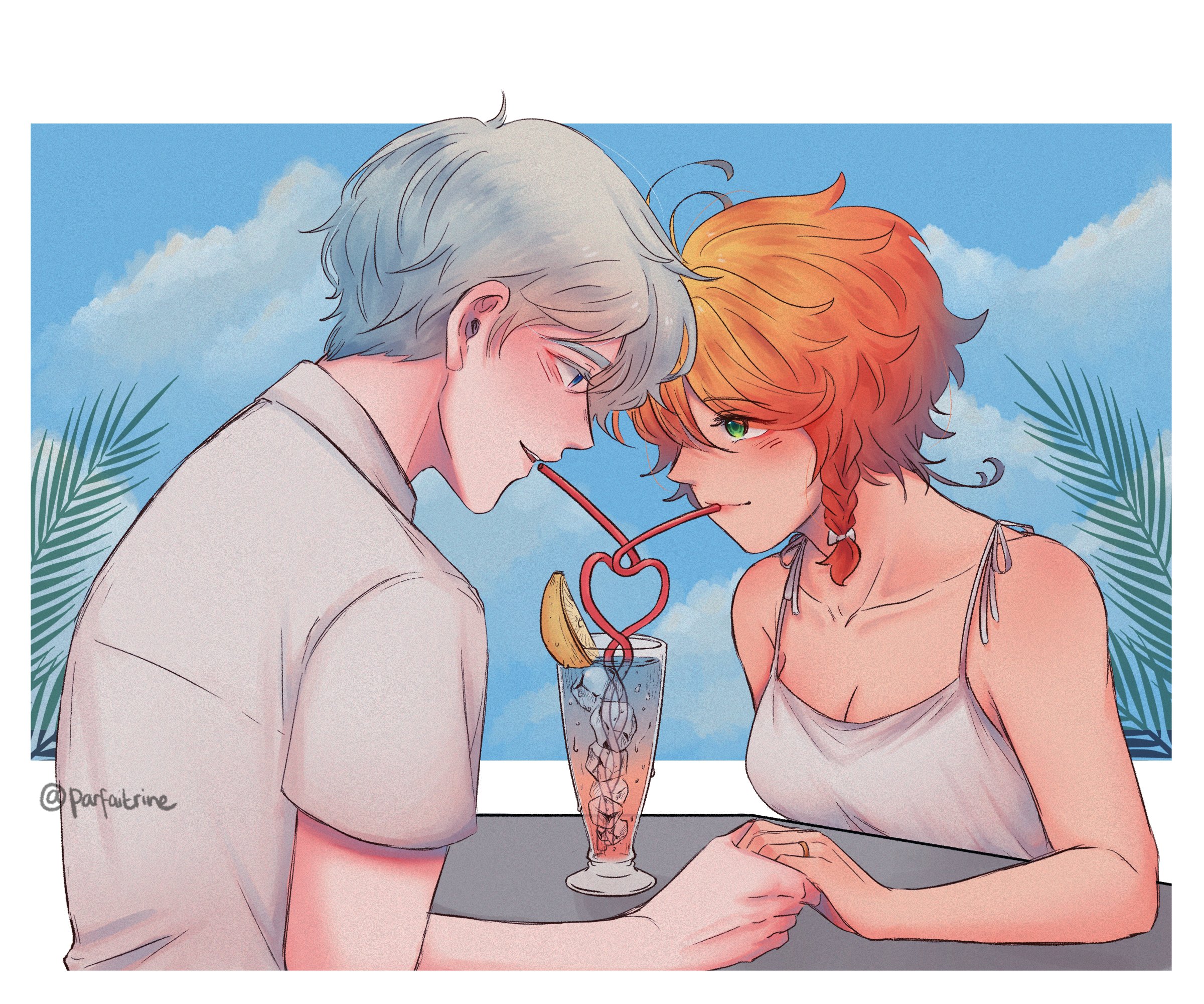 1boy 1girl bare_shoulders blue_eyes blue_sky breasts cup dress drinking drinking_glass drinking_straw emma_(yakusoku_no_neverland) green_eyes green_hair highres ice ice_cube jewelry juice medium_breasts multicolored_hair norman_(yakusoku_no_neverland) open_mouth orange_hair parfaitrine ring shirt short_hair sky white_background white_dress white_shirt yakusoku_no_neverland