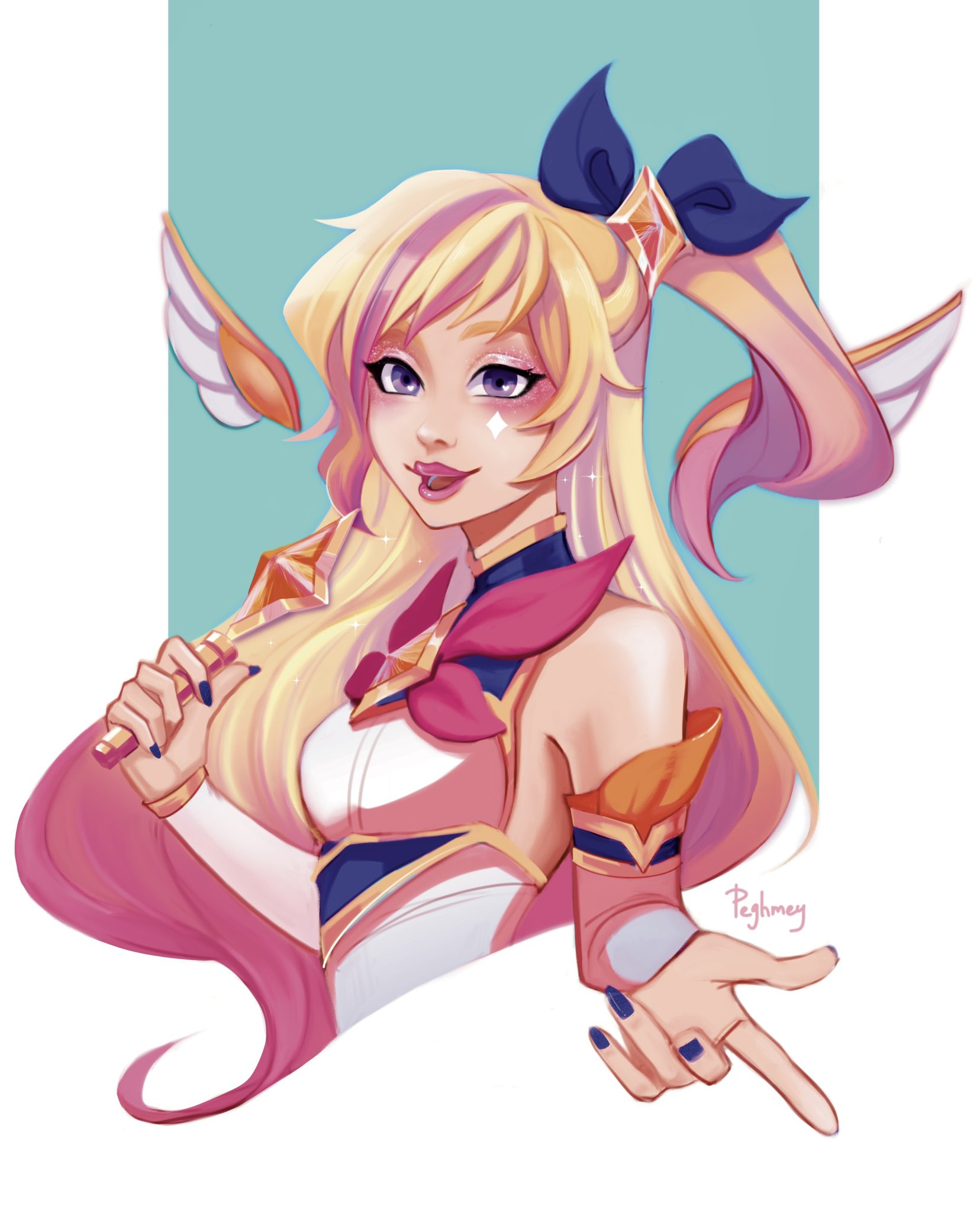 1girl :d artist_name bare_shoulders blush breasts cropped_torso detached_sleeves detached_wings green_background hair_ribbon highres holding holding_wand league_of_legends long_hair medium_breasts multicolored_hair nail_polish open_mouth peghmey pink_hair ponytail purple_eyes purple_nails purple_ribbon ribbon smile solo star_guardian_seraphine wand white_background wings