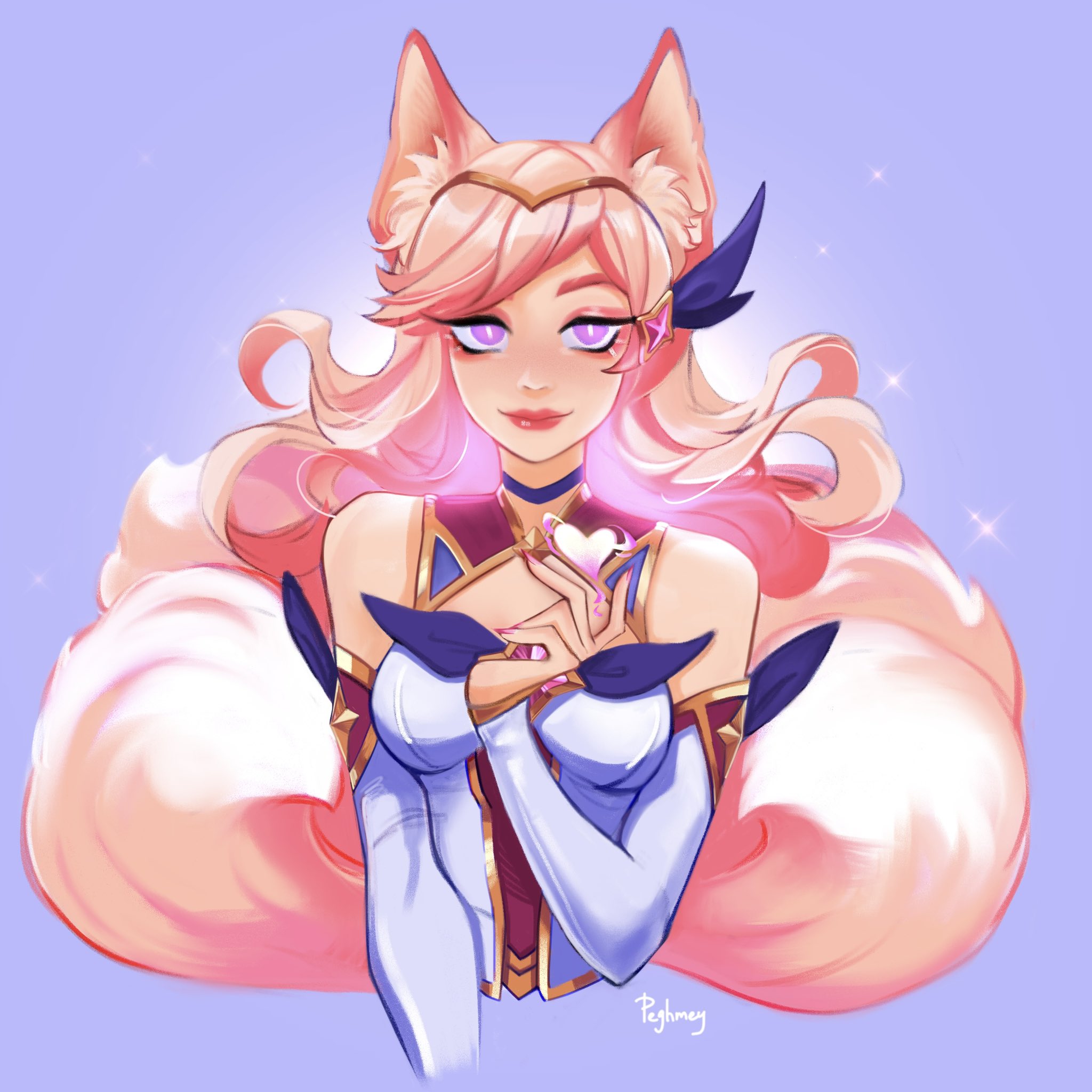 1girl ahri_(league_of_legends) animal_ears artist_name bare_shoulders blonde_hair blue_ribbon breasts choker cropped_torso detached_sleeves fox_ears fox_girl fox_tail gem hair_ornament hair_ribbon highres large_breasts league_of_legends long_hair looking_at_viewer peghmey pink_eyes purple_choker ribbon smile sparkle star_guardian_(league_of_legends) star_guardian_ahri tail upper_body white_sleeves