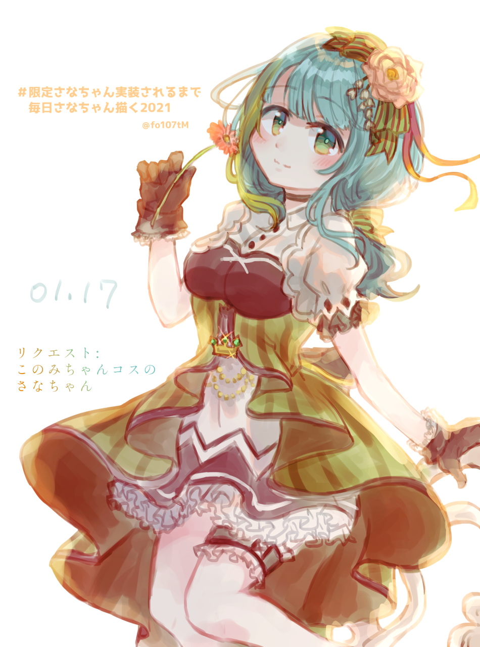 1girl aqua_hair arm_at_side blunt_bangs blush brown_choker brown_dress brown_gloves buttons chain choker clenched_hand collared_shirt cosplay cropped_jacket crown_(symbol) dated dress feet_out_of_frame flower fold-over_gloves frilled_dress frilled_gloves frilled_sleeves frilled_thigh_strap frills futaba_sana gem gloves green_gem green_ribbon hair_flower hair_ornament hair_ribbon haruna_konomi haruna_konomi_(cosplay) highres holding holding_flower jacket leg_up looking_at_viewer low_ponytail magia_record:_mahou_shoujo_madoka_magica_gaiden magical_girl mahou_shoujo_madoka_magica multicolored_hair pink_flower ponytail puffy_short_sleeves puffy_sleeves ribbon shirt shirt_under_dress short_dress short_sleeves sidelocks smile solo split_mouth strapless strapless_dress streaked_hair striped_ribbon swept_bangs thigh_strap totte wavy_hair white_jacket white_shirt