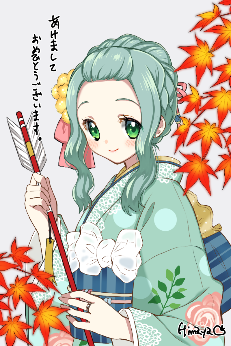 1girl aqua_hair aqua_kimono arrow_(projectile) autumn_leaves bangs_pinned_back blue_sash blush braid braided_bun dot_nose floral_print flower futaba_sana futaba_sana_(haregi_costume) green_eyes hair_bun hair_ornament hair_ribbon hamaya han'eri highres himaya holding holding_arrow japanese_clothes kanzashi kimono lace lace-trimmed_kimono lace_trim leaf long_sleeves looking_at_viewer magia_record:_mahou_shoujo_madoka_magica_gaiden mahou_shoujo_madoka_magica maple_leaf obi obidome obijime pink_flower pink_ribbon polka_dot polka_dot_kimono print_kimono ribbon sash sidelocks signature smile solo striped_sash upper_body wavy_hair