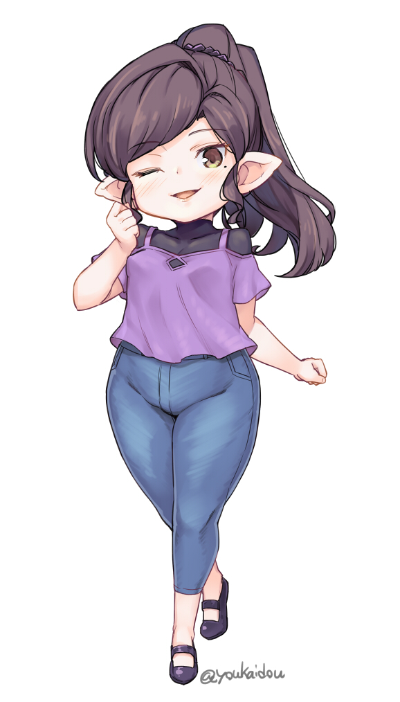 1girl arulumaya black_hair black_shoes blush brown_eyes camisole capri_pants contemporary denim female_focus full_body granblue_fantasy harvin jeans jingai_modoki mole mole_under_eye one_eye_closed open_mouth pants pointy_ears ponytail shoes sidelocks simple_background solo twitter_username white_background