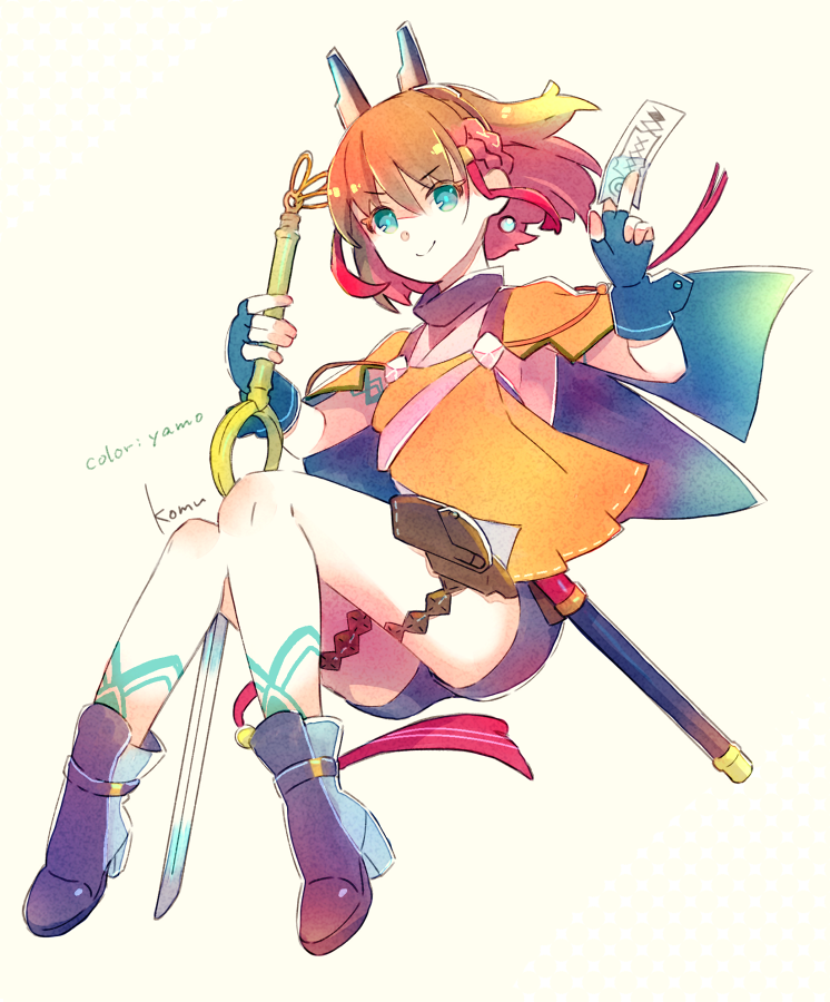 1girl azure_striker_gunvolt azure_striker_gunvolt_3 blue_eyes body_markings breasts brown_hair earrings japanese_clothes jewelry kirin_(gunvolt) miko multicolored_hair red_hair short_hair short_pants shorts sideboob signature sword talisman weapon
