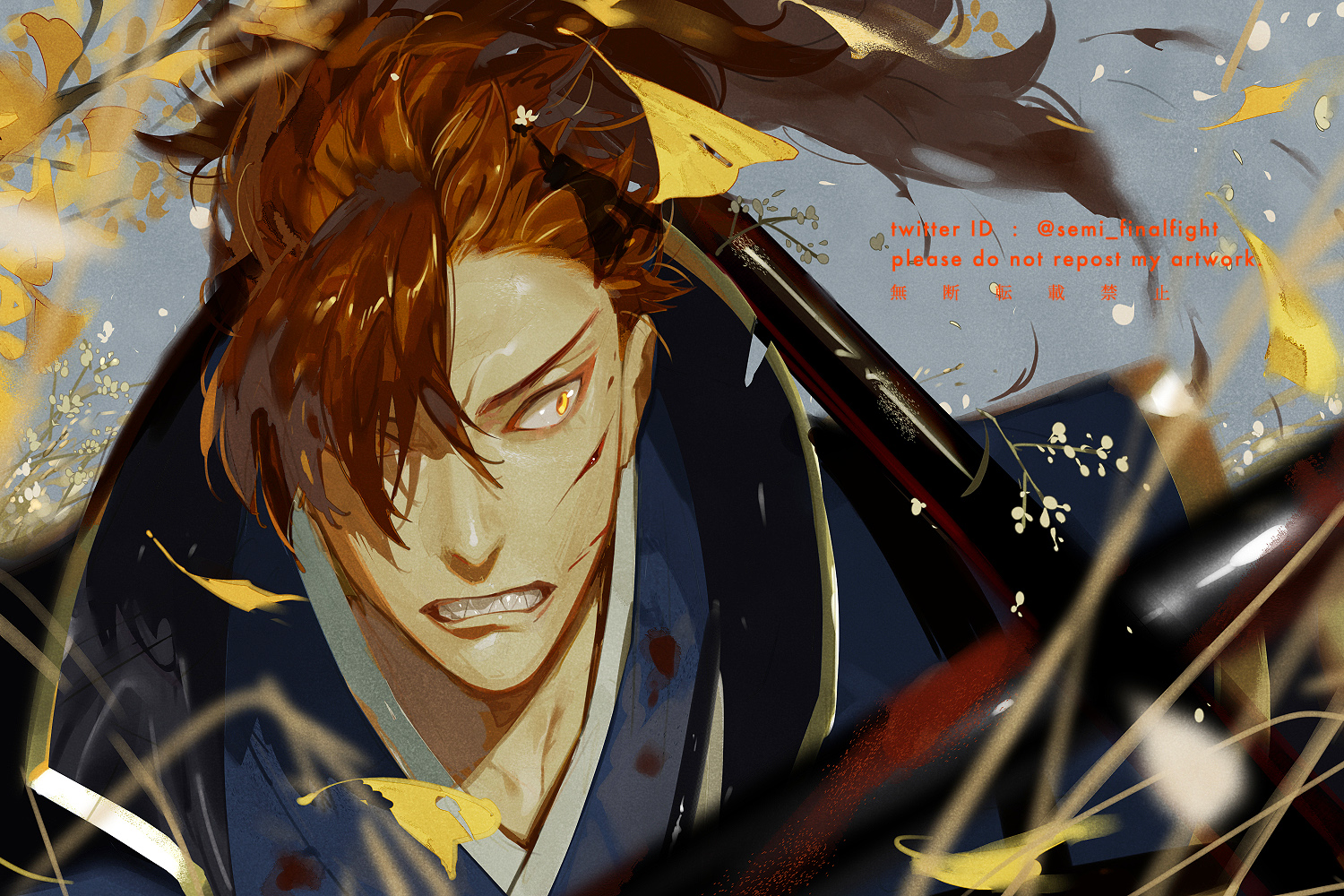 1boy armor bad_id bad_twitter_id blood blood_on_clothes blood_on_face commentary_request falling_leaves fate/grand_order fate/type_redline fate_(series) flower hair_over_one_eye injury japanese_clothes jinbaori kimono koha-ace leaf long_hair long_sleeves looking_away male_focus mori_nagayoshi_(fate) mori_nagayoshi_(second_ascension)_(fate) official_alternate_costume polearm ponytail red_hair semi_(p-poco) sharp_teeth solo spear spiked_hair teeth twitter_username upper_body weapon yellow_eyes