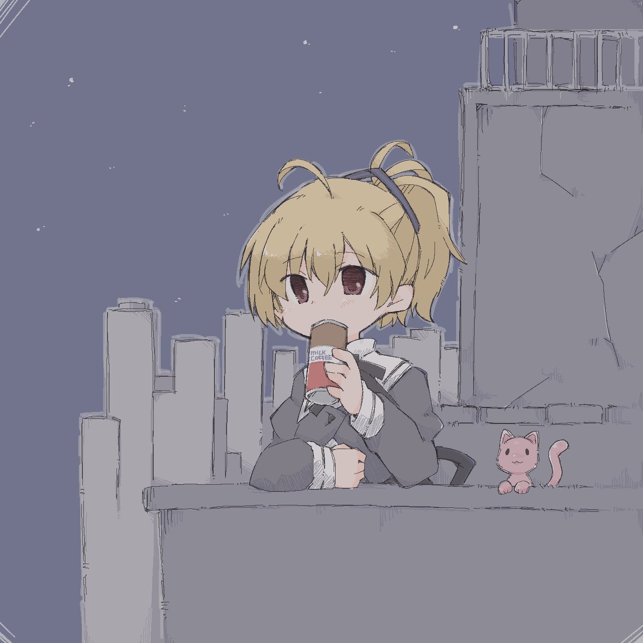 1girl :3 ahoge ando_tazusa animal assault_lily black_ribbon blonde_hair brown_eyes building can canned_coffee cat commentary_request covered_mouth cropped_jacket drink_can drinking hair_between_eyes hair_ribbon hands_up highres holding holding_can juliet_sleeves light_blush long_sleeves looking_away neck_ribbon night outdoors ponytail puffy_sleeves ribbon rooftop school_uniform short_hair sky skyscraper solo toyo_(sameden46) yurigaoka_girls_academy_school_uniform