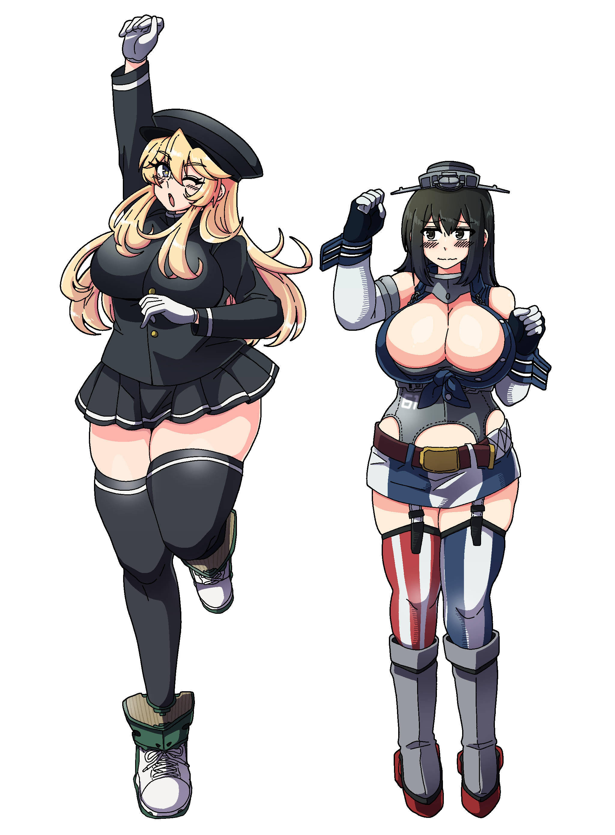 2girls absurdres akitsu_maru_(kancolle) akitsu_maru_kai_(kancolle) akitsu_maru_kai_(kancolle)_(cosplay) american_flag american_flag_legwear asymmetrical_legwear black_eyes black_hair black_headwear black_jacket black_skirt black_thighhighs blonde_hair blue_eyes breasts commission cosplay costume_switch front-tie_top full_body garter_straps gloves hat highres iowa_(kancolle) iowa_(kancolle)_(cosplay) jacket k_(shiganai_shakaijin) kantai_collection large_breasts military military_hat military_uniform miniskirt mismatched_legwear multiple_girls peaked_cap pixiv_commission pleated_skirt short_hair skirt standing standing_on_one_leg star-shaped_pupils star_(symbol) striped_clothes striped_thighhighs symbol-shaped_pupils thighhighs vertical-striped_clothes vertical-striped_thighhighs white_gloves