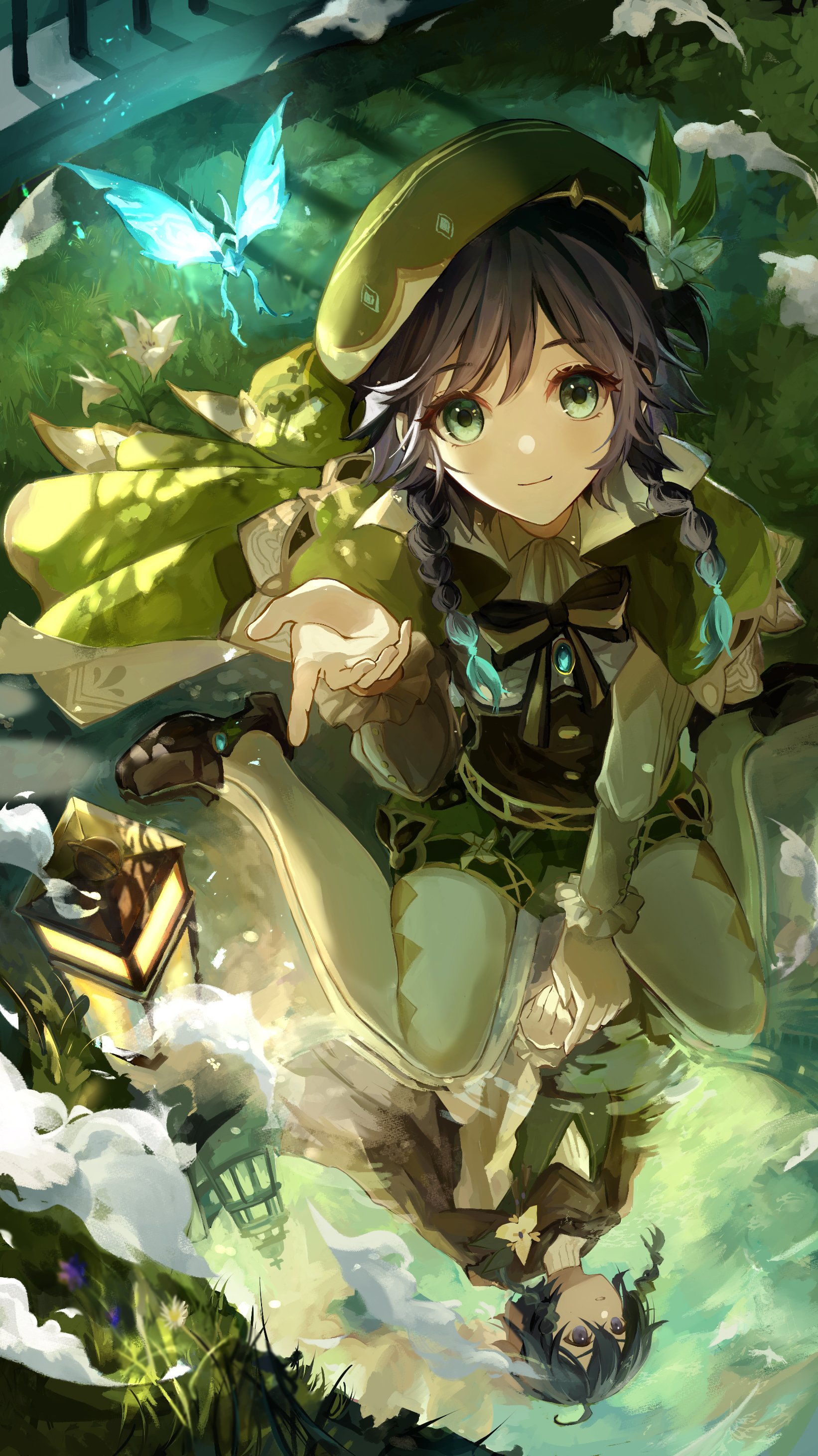 1boy absurdres aqua_hair beret black_bow black_bowtie black_hair bow bowtie braid brown_corset brown_shoes bug buttons cape closed_mouth collared_cape commentary_request corset crystalfly_(genshin_impact) different_reflection eyelashes fence flower frilled_sleeves frills full_body fusyo_fuka gem genshin_impact gradient_hair grass green_cape green_eyes green_hat green_shorts green_theme hair_between_eyes hair_flower hair_ornament hand_up hat highres lantern long_sleeves looking_at_viewer looking_up male_focus medium_hair multicolored_hair nameless_bard_(genshin_impact) outdoors outstretched_arm pantyhose reflection reflective_liquid shirt shoes short_shorts shorts side_braids sidelocks sitting smile solo striped_bow striped_bowtie striped_clothes twin_braids venti_(genshin_impact) wariza water white_flower white_pantyhose white_shirt