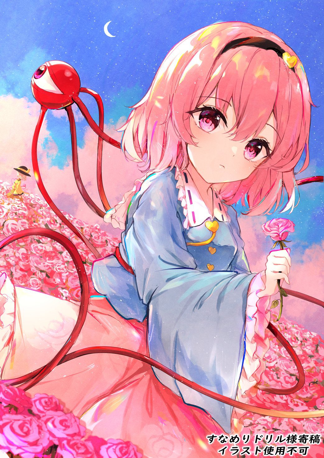 2girls bad_id bad_twitter_id black_hairband black_headwear blouse blue_shirt blush bow closed_mouth cloud commentary cowboy_shot crescent_moon expressionless field floral_print flower flower_field frilled_shirt_collar frilled_skirt frilled_sleeves frills green_skirt hair_between_eyes hair_ornament hairband hat hat_bow heart heart_hair_ornament highres holding holding_flower komeiji_koishi komeiji_satori long_sleeves looking_at_viewer medium_hair moon multiple_girls pink_eyes pink_flower pink_hair pink_rose pink_skirt ribbon_trim rose rose_print shangurira shirt siblings sisters skirt sky star_(sky) starry_sky third_eye touhou wide_sleeves yellow_bow yellow_shirt