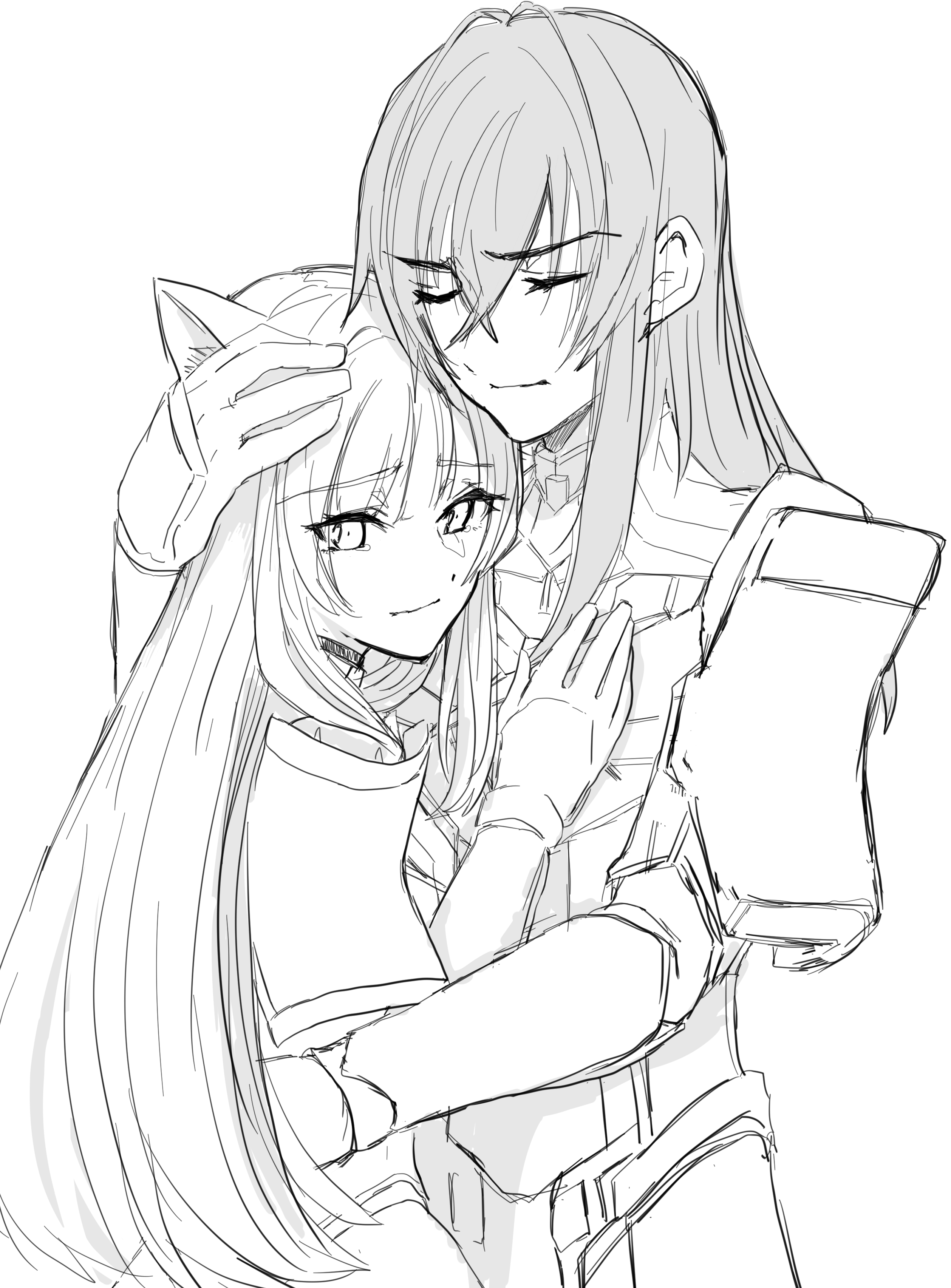 1boy 1girl absurdres animal_ears armor cat_ears couple greyscale highres hug long_hair m_(xenoblade) monochrome n_(xenoblade) nanashinonanani sketch spoilers white_background xenoblade_chronicles_(series) xenoblade_chronicles_3