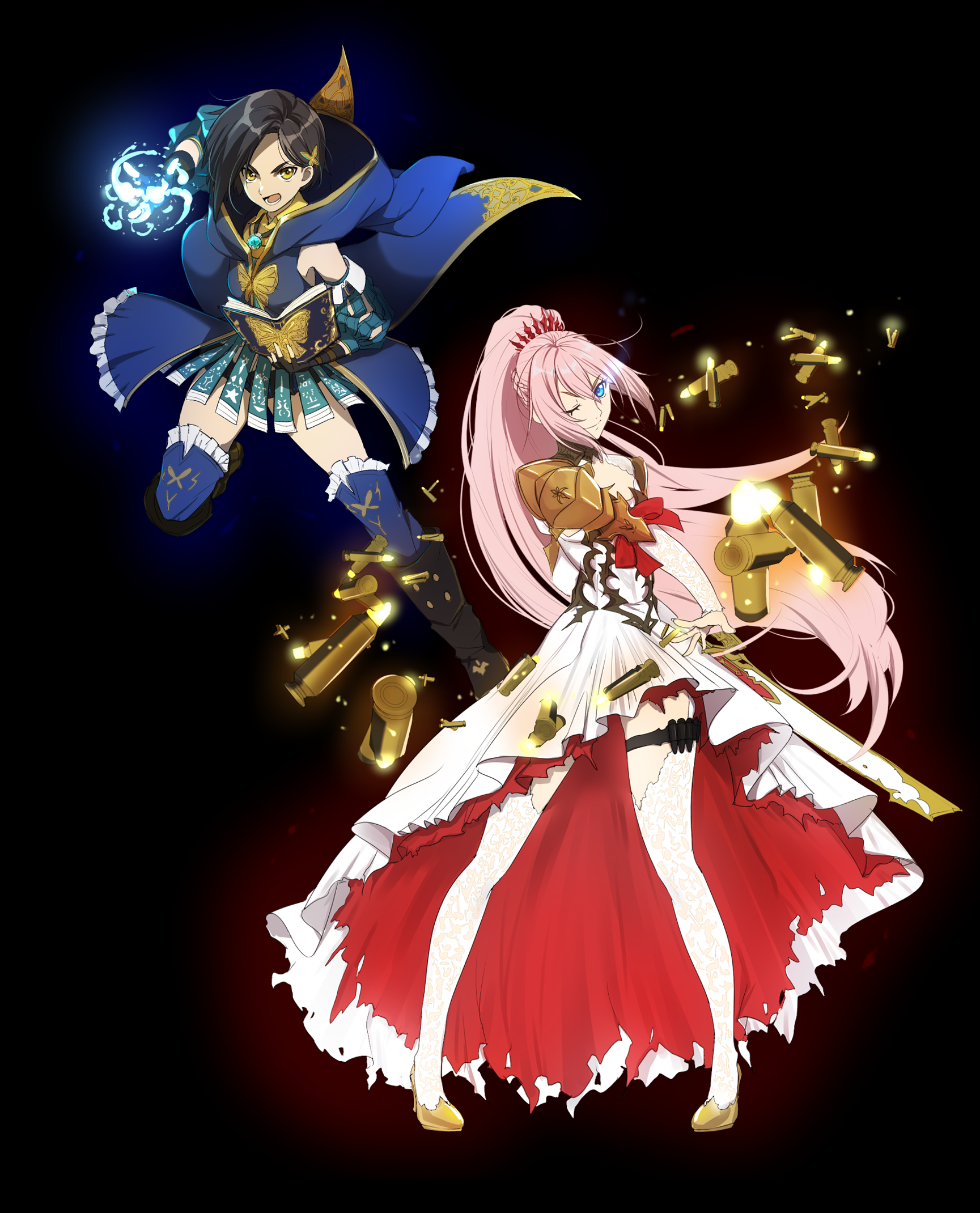 2girls ;) armor black_background black_footwear black_gloves black_hair black_shorts blue_eyes blue_gem blue_sleeves blue_thighhighs book boots butterfly_hair_ornament closed_mouth detached_sleeves dress fingerless_gloves floating_hair frilled_thighhighs frills full_body gem gloves grimoire gun hair_ornament high_heels high_ponytail highres holding holding_gun holding_weapon hood hood_down hooded_coat jewelry knee_boots long_hair long_sleeves looking_at_viewer micro_shorts multiple_girls one_eye_closed open_mouth pendant pink_hair ponytail pumps rifle rinwell_(tales) shionne_(tales) shoes short_hair shorts shoulder_armor smile tales_of_(series) tales_of_arise thigh_strap thighhighs tusia v-shaped_eyebrows very_long_hair weapon white_dress white_thighhighs yellow_eyes yellow_shoes