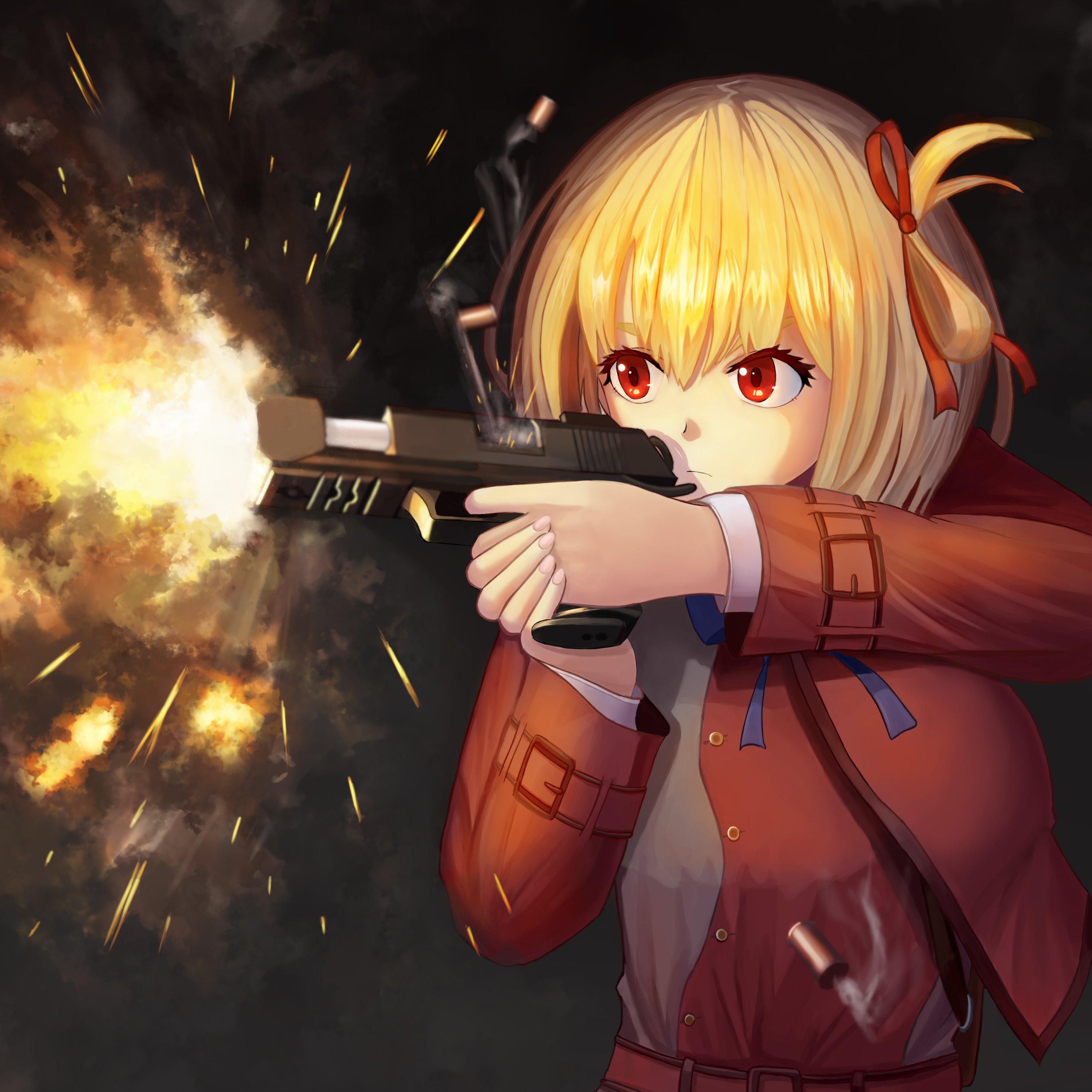 1girl absurdres bad_anatomy black_background blonde_hair blue_bow bow dress firing gun gyeonyu_art highres long_sleeves lycoris_recoil lycoris_uniform nishikigi_chisato red_eyes red_ribbon ribbon shell_casing solo two-tone_dress upper_body weapon
