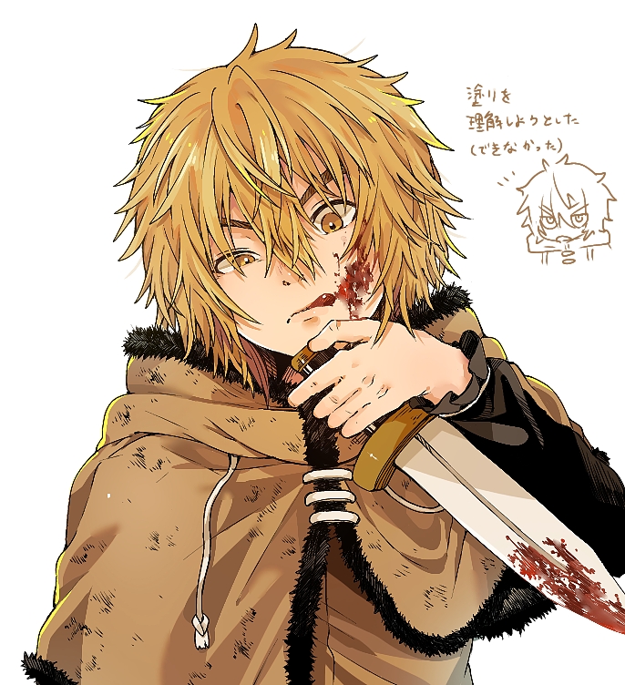 1boy blonde_hair blood blood_on_face bloody_weapon brown_tunic knife looking_at_viewer messy_hair short_hair thorfinn tunic user_xcze3872 viking vinland_saga weapon yellow_eyes