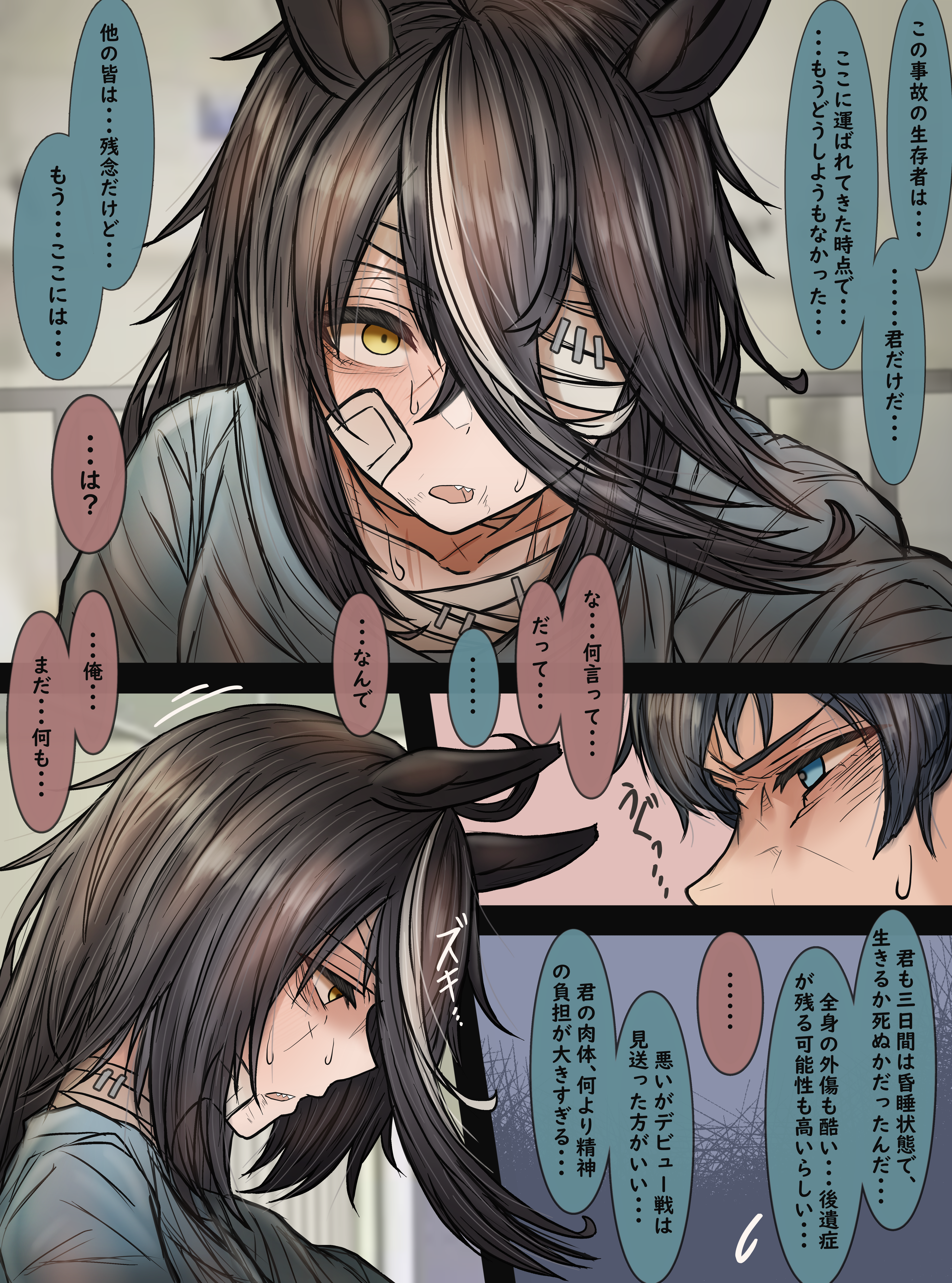 1boy 1girl absurdres ahoge animal_ears arthur_b._hancock_iii bandage_on_face bandage_over_one_eye bandaged_chest bandaged_neck bandages black_hair blue_eyes collarbone collared_shirt genderswap genderswap_(mtf) green_necktie hair_between_eyes highres horse_ears horse_girl hospital_gown leogust light_brown_hair long_bangs long_hair motion_lines narrowed_eyes necktie original outside_border personification scar scar_on_face sharp_teeth shirt speech_bubble spoken_sweatdrop stapled sunday_silence_(racehorse) sweat sweatdrop teeth translation_request umamusume white_shirt yellow_eyes