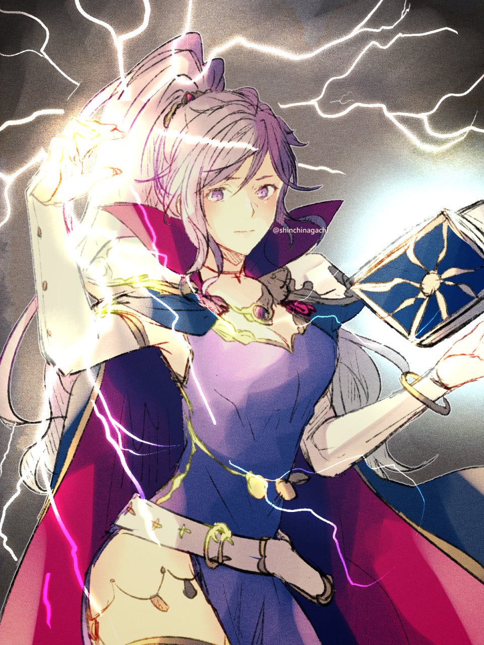 1girl armor belt book cape electricity fire_emblem fire_emblem:_genealogy_of_the_holy_war fire_emblem_heroes highres ishtar_(fire_emblem) jewelry long_hair magic nintendo nishimura_(shinchinagachi) pauldrons purple_eyes purple_hair shoulder_armor twitter_username