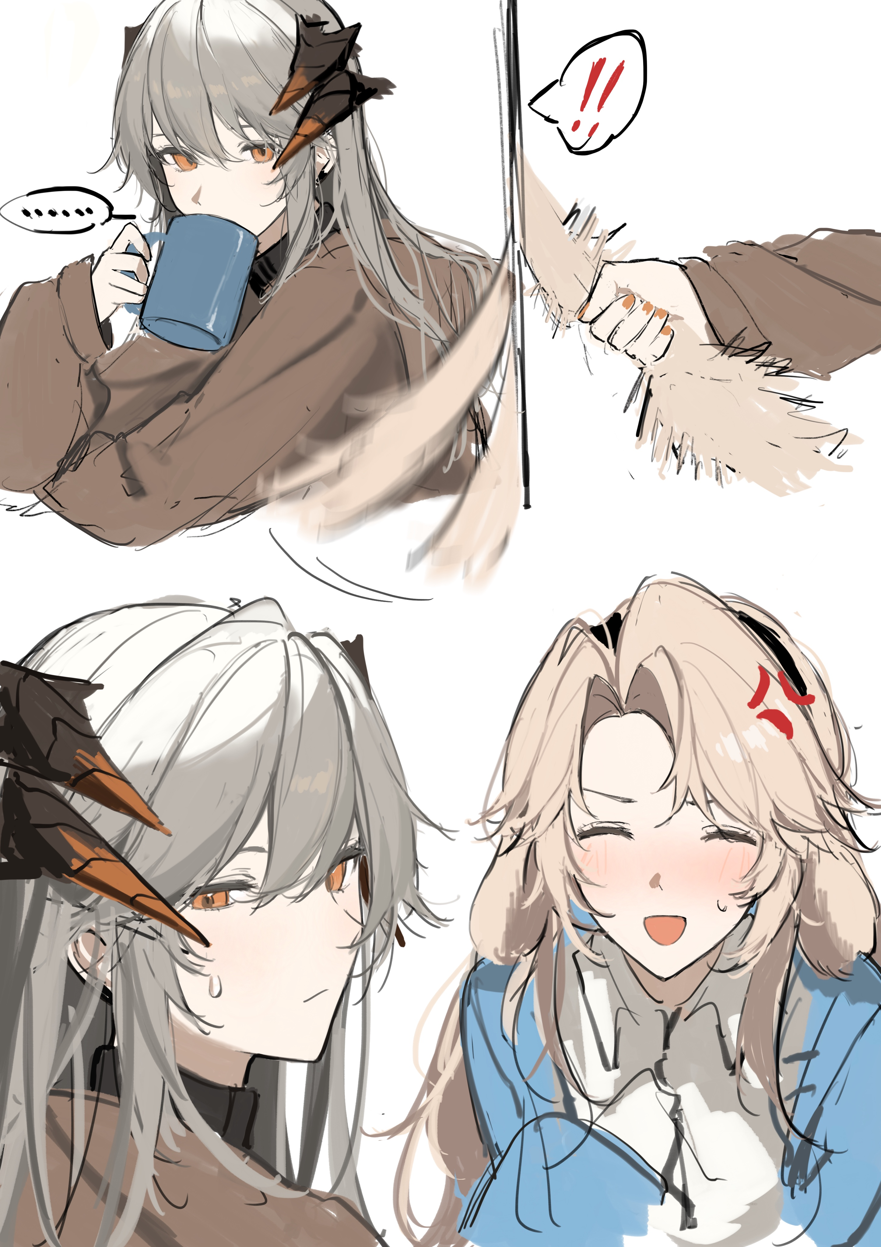 ! ... 2girls absurdres afterimage anger_vein animal_ears arknights black_hairband blonde_hair blue_jacket blush brown_sweater closed_eyes collared_shirt cup dog_ears dog_girl dog_tail dragon_girl dragon_horns drinking earclip hairband highres holding holding_cup horns jacket joshua_(shisanli934) kristen_(arknights) long_sleeves mug multiple_girls nail_polish open_clothes open_jacket open_mouth orange_eyes orange_nails saria_(arknights) shirt spoken_ellipsis spoken_exclamation_mark sweatdrop sweater tail tail_grab tail_wagging white_shirt