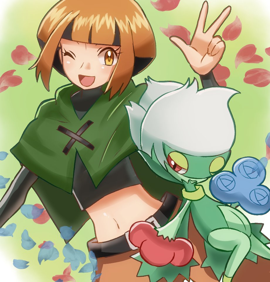 1girl belt black_belt black_shirt blunt_bangs bob_cut brown_eyes brown_pants cape capelet gardenia_(pokemon) gen_4_pokemon green_capelet long_sleeves midriff monster_girl multicolored_hair navel nintendo one_eye_closed orange_eyes orange_hair pants plant_girl pokemon pokemon_(creature) pokemon_diamond/pearl/platinum red_eyes roserade shirt short_hair shugara torn_clothes torn_pants two-tone_hair v white_hair