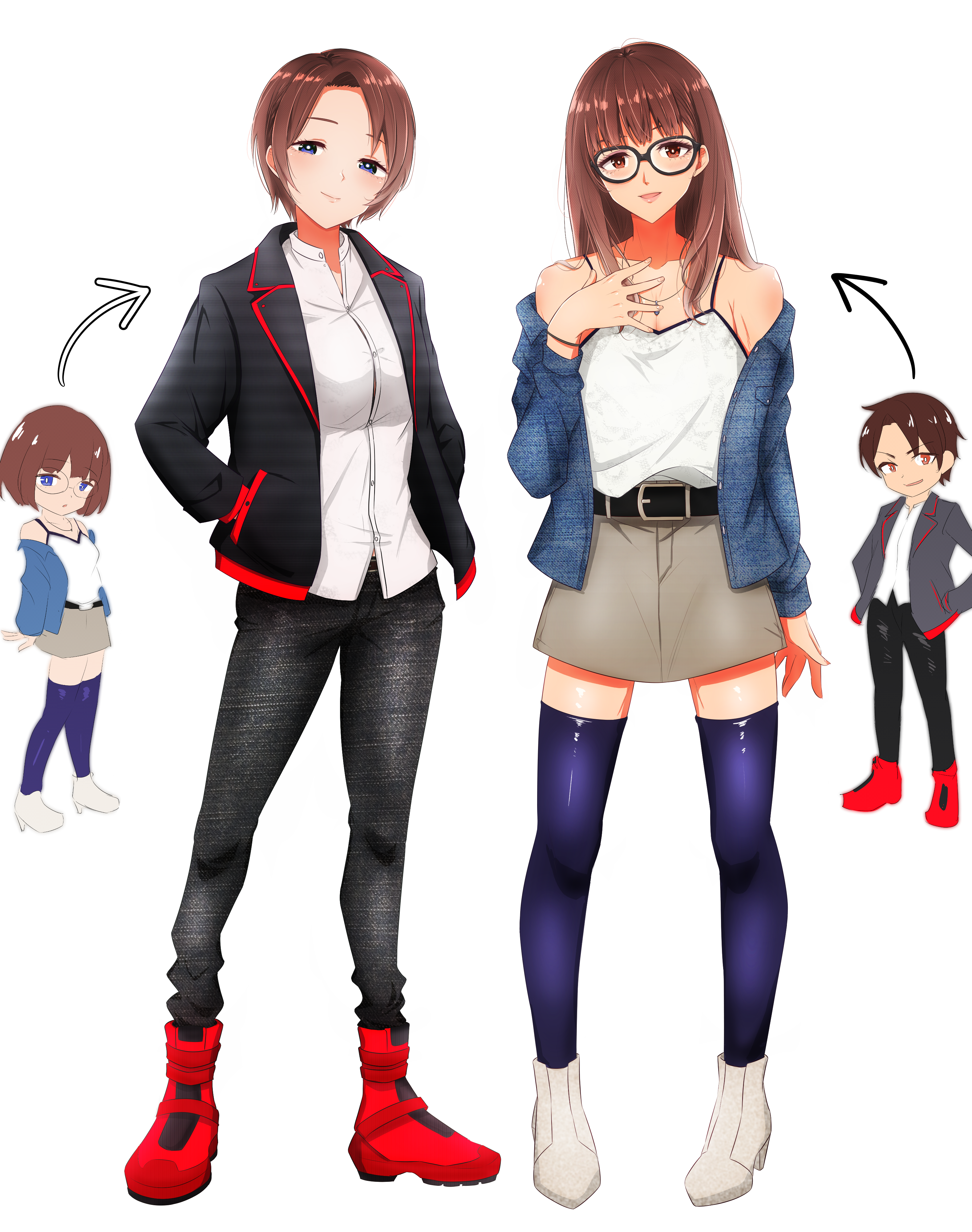 1boy 1girl absurdres arrow_(symbol) belt black-framed_eyewear black_belt black_jacket black_pants blue_eyes blue_jacket blue_thighhighs breasts brown_eyes brown_hair camisole cosplay costume_switch crossdressing full_body glasses grey_skirt highres jacket jewelry long_hair long_sleeves medium_breasts miniskirt necklace nusisippi open_clothes open_jacket original pants red_footwear reverse_trap shirt shoes short_hair skirt standing thighhighs tomboy trap white_camisole white_footwear white_shirt
