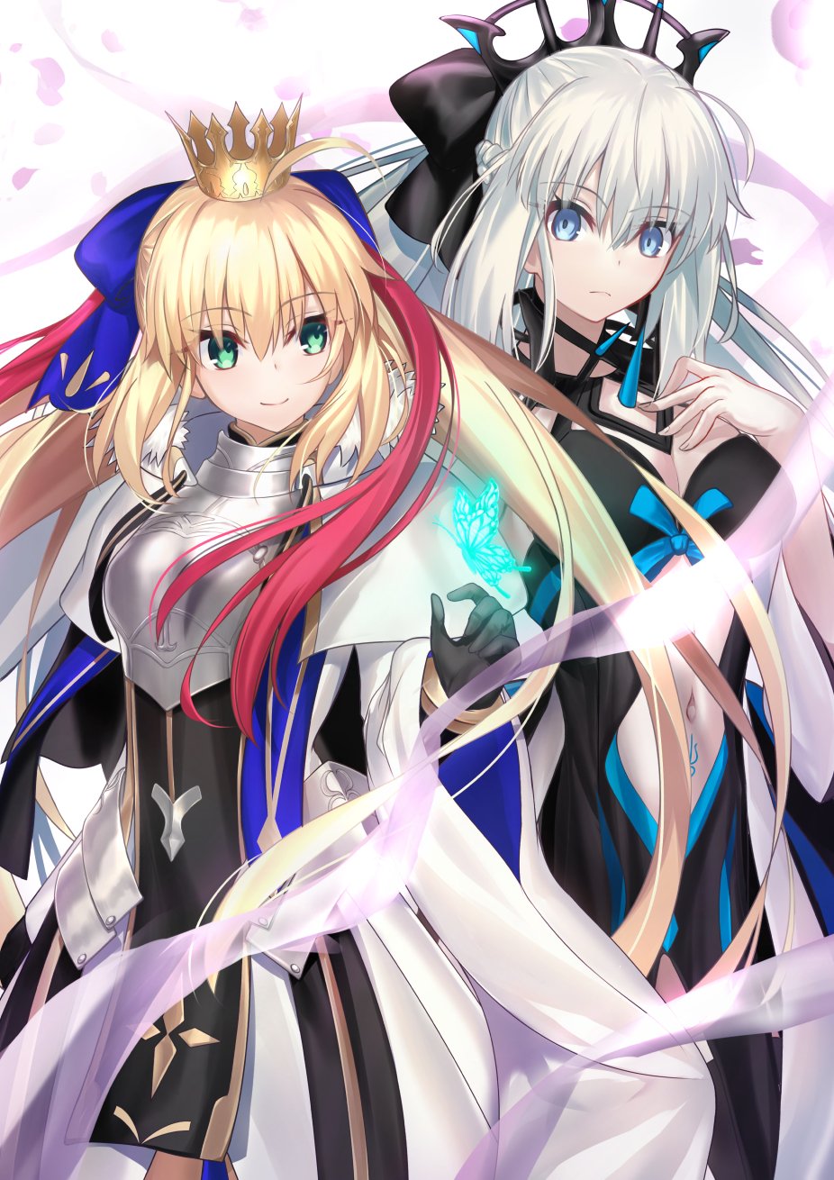 2girls ahoge armor armored_dress artoria_caster_(fate) artoria_caster_(third_ascension)_(fate) artoria_pendragon_(fate) black_bow black_dress blonde_hair blue_eyes bow braid center_opening clothing_cutout crown diamond_hairband dress facial_mark fate/grand_order fate_(series) forehead_mark green_eyes half_up_braid highres holding holding_staff marmyadose_(fate) morgan_le_fay_(fate) morgan_le_fay_(third_ascension)_(fate) multiple_girls neko_daruma smile staff stomach_cutout stomach_tattoo tattoo two-tone_dress white_hair