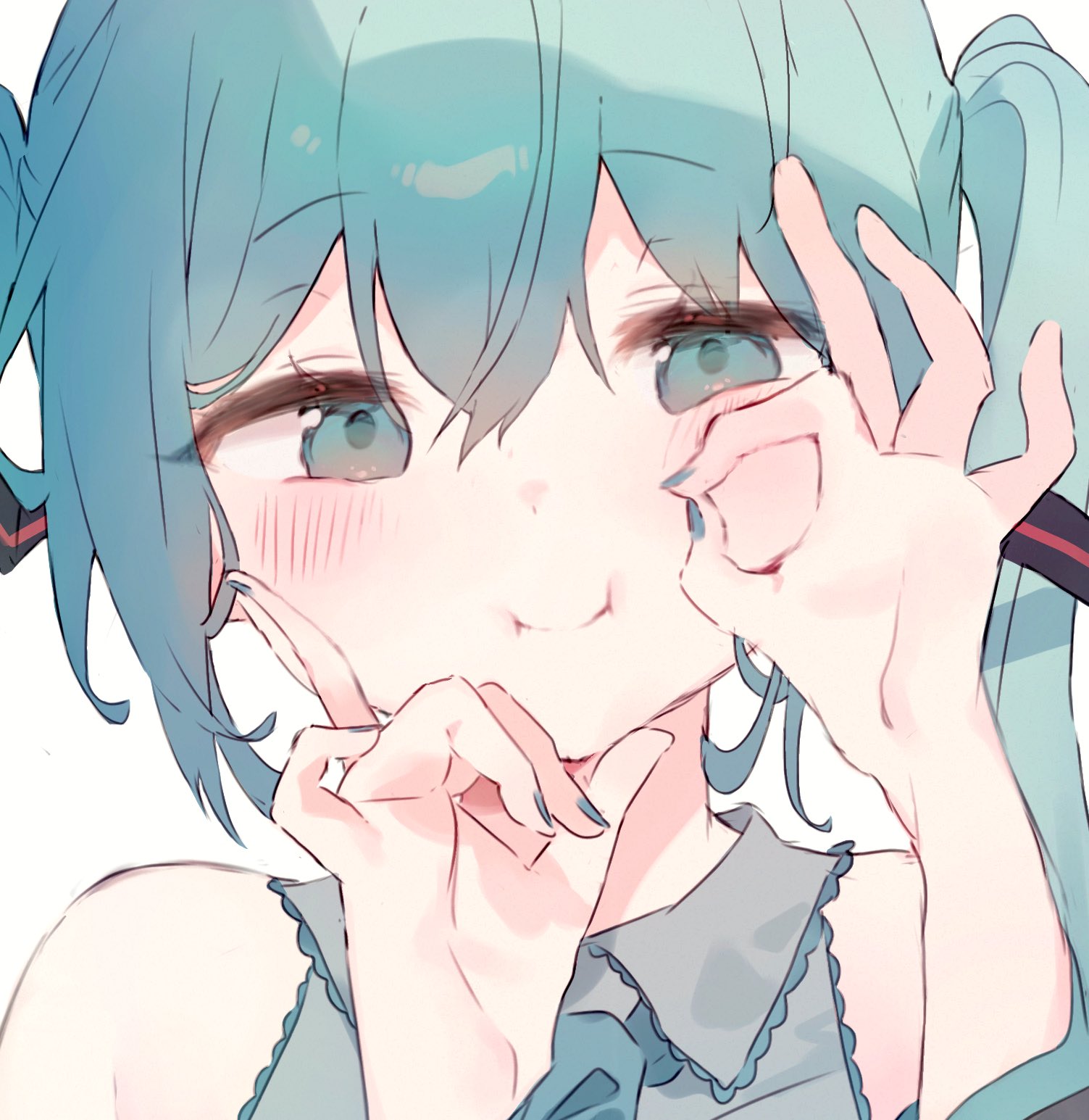 1girl :i aqua_hair aqua_nails blue_necktie blush bunchi cheek_press cheek_squash close-up closed_mouth detached_sleeves grey_shirt hair_between_eyes hair_ornament hands_on_own_chest hatsune_miku highres looking_at_viewer nail_polish necktie ok_sign portrait puffy_cheeks shirt simple_background sleeveless sleeveless_shirt solo twintails vocaloid white_background