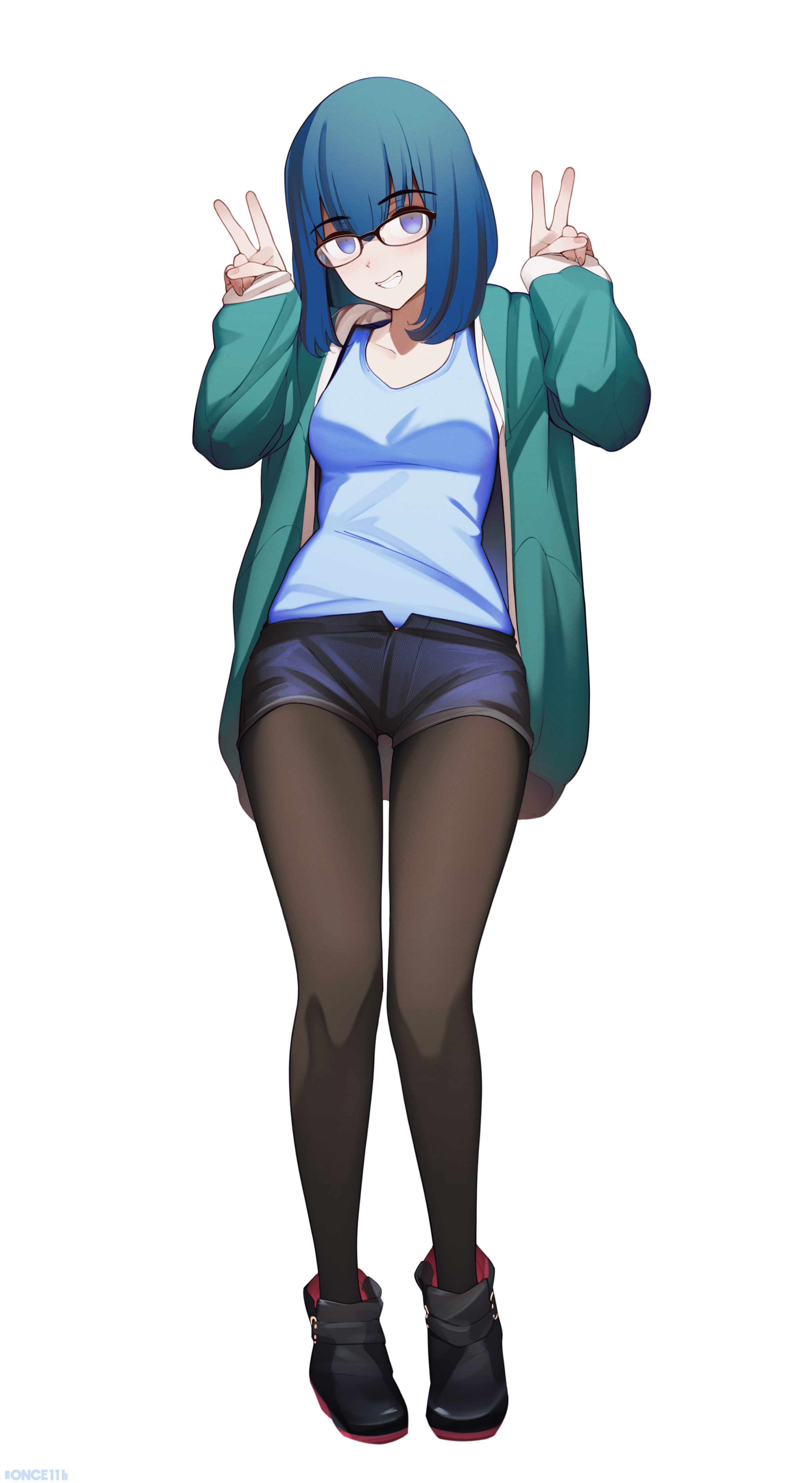 1girl absurdres alternate_costume artist_name black_boots black_pantyhose blue_eyes blue_hair blue_hoodie blue_tank_top blush boots breasts collarbone commission commissioner_upload denim denim_shorts double_v full_body grin highres hina_(hinamatsuri) hinamatsuri_(manga) hood hoodie looking_at_viewer once_11h pantyhose parted_lips short_hair short_shorts shorts simple_background small_breasts smile solo tank_top teeth twitter_username v white_background
