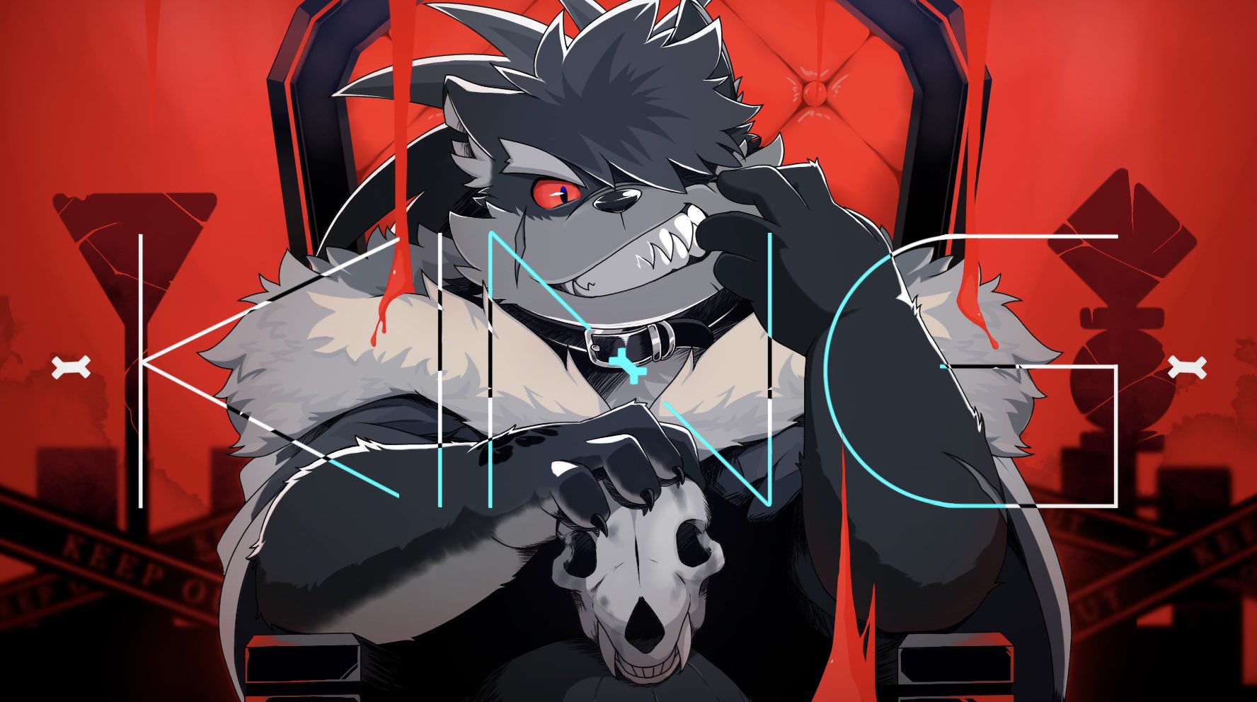 1boy ambiguous_red_liquid animal_ears animal_nose belt colored_sclera commentary_request dog_boy dog_ears fingernails fur_trim furry furry_male hair_over_one_eye hand_tattoo highres holding holding_skull king_(vocaloid) limited_palette long_hair male_focus on_throne ponytail ponzu_tas red_background red_sclera scar scar_on_face sharp_fingernails sharp_teeth shino_(housamo) sitting skull solo tattoo teeth throne tokyo_houkago_summoners upper_body vocaloid