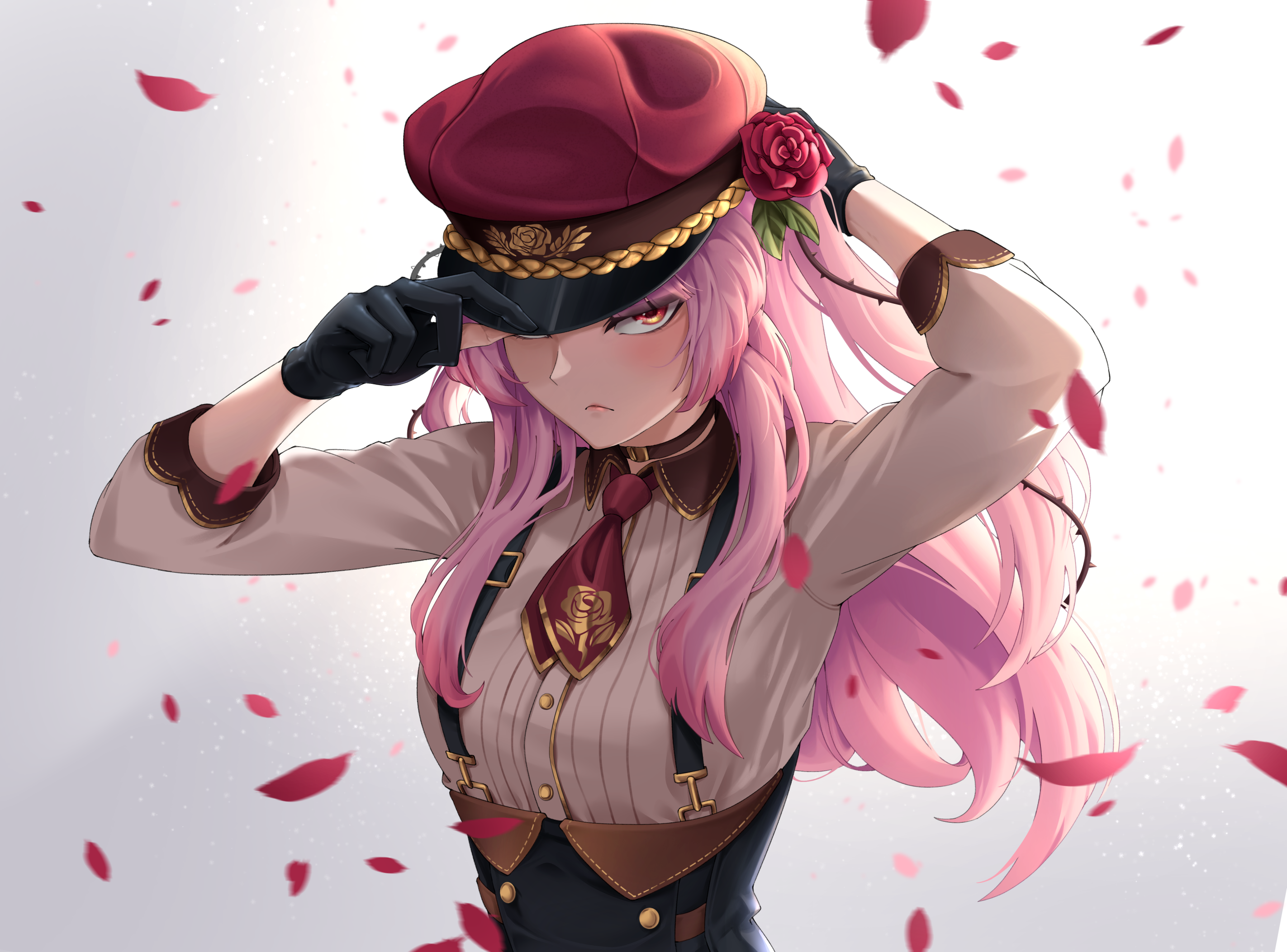 1girl arms_up black_gloves closed_mouth collared_shirt dress_shirt floral_print flower frown gloves grey_background hair_flower hair_ornament hat hat_over_one_eye highres long_sleeves looking_at_viewer military_hat necktie nijisanji nijisanji_en ootoii petals plant print_necktie red_eyes red_flower red_hat red_necktie rosemi_lovelock shirt short_necktie side_ponytail solo suspenders upper_body vines virtual_youtuber white_shirt wing_collar