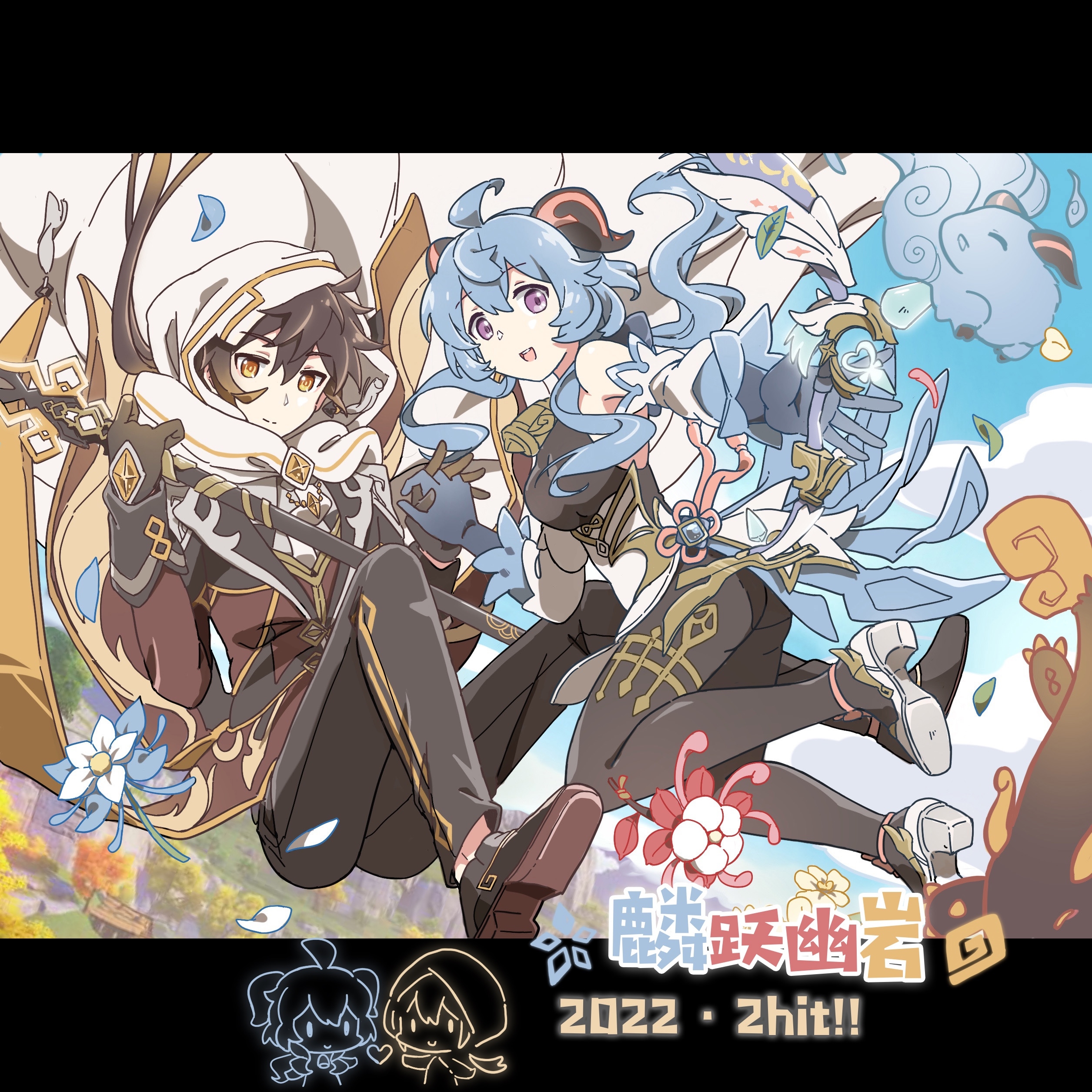 1boy 1girl 2022 absurdres ahoge amos'_bow_(genshin_impact) bare_shoulders bell biabiaji02 black_bodysuit black_footwear black_gloves black_hair blue_hair bodystocking bodysuit bow breasts brown_bodysuit brown_hair chinese_commentary chinese_knot cloud coattails collared_shirt cowbell detached_sleeves dragon earrings falling formal_clothes full_body ganyu_(genshin_impact) ganyu_(qilin)_(genshin_impact) genshin_impact glaze_lily gloves goat_horns gradient_hair hair_between_eyes hair_tie heart highres holding holding_hands holding_weapon hood hood_up hooded_coat horns interlocked_fingers jacket jewelry leotard leotard_under_clothes long_hair long_sleeves looking_at_viewer low_ponytail medium_breasts mixed-language_text multicolored_hair neck_bell necktie open_mouth outdoors pants ponytail purple_eyes rex_lapis_(genshin_impact) shirt shoes sidelocks silk_flower_(genshin_impact) single_earring sky smile suit tailcoat tassel tassel_earrings teeth tree upper_teeth_only vest vision_(genshin_impact) vortex_vanquisher_(genshin_impact) waist_cape weapon white_necktie white_sleeves yellow_eyes zhongli_(archon)_(genshin_impact) zhongli_(genshin_impact)