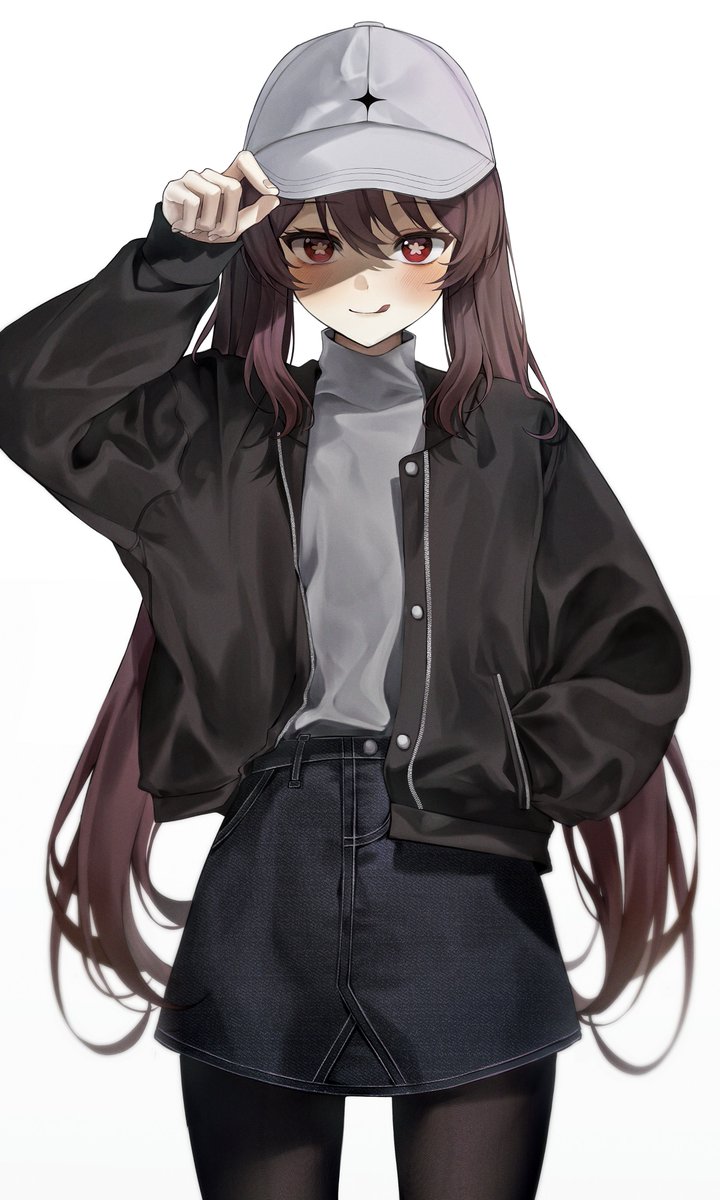 1girl alternate_costume bad_id bad_twitter_id black_jacket black_pantyhose black_skirt blush brown_hair cowboy_shot denim denim_skirt flower-shaped_pupils genshin_impact grey_headwear grey_shirt hand_in_pocket hand_on_headwear highres hu_tao_(genshin_impact) jacket long_hair long_sleeves looking_at_viewer pantyhose shirt simple_background skirt sleeves_past_wrists solcha solo symbol-shaped_pupils turtleneck twintails white_background