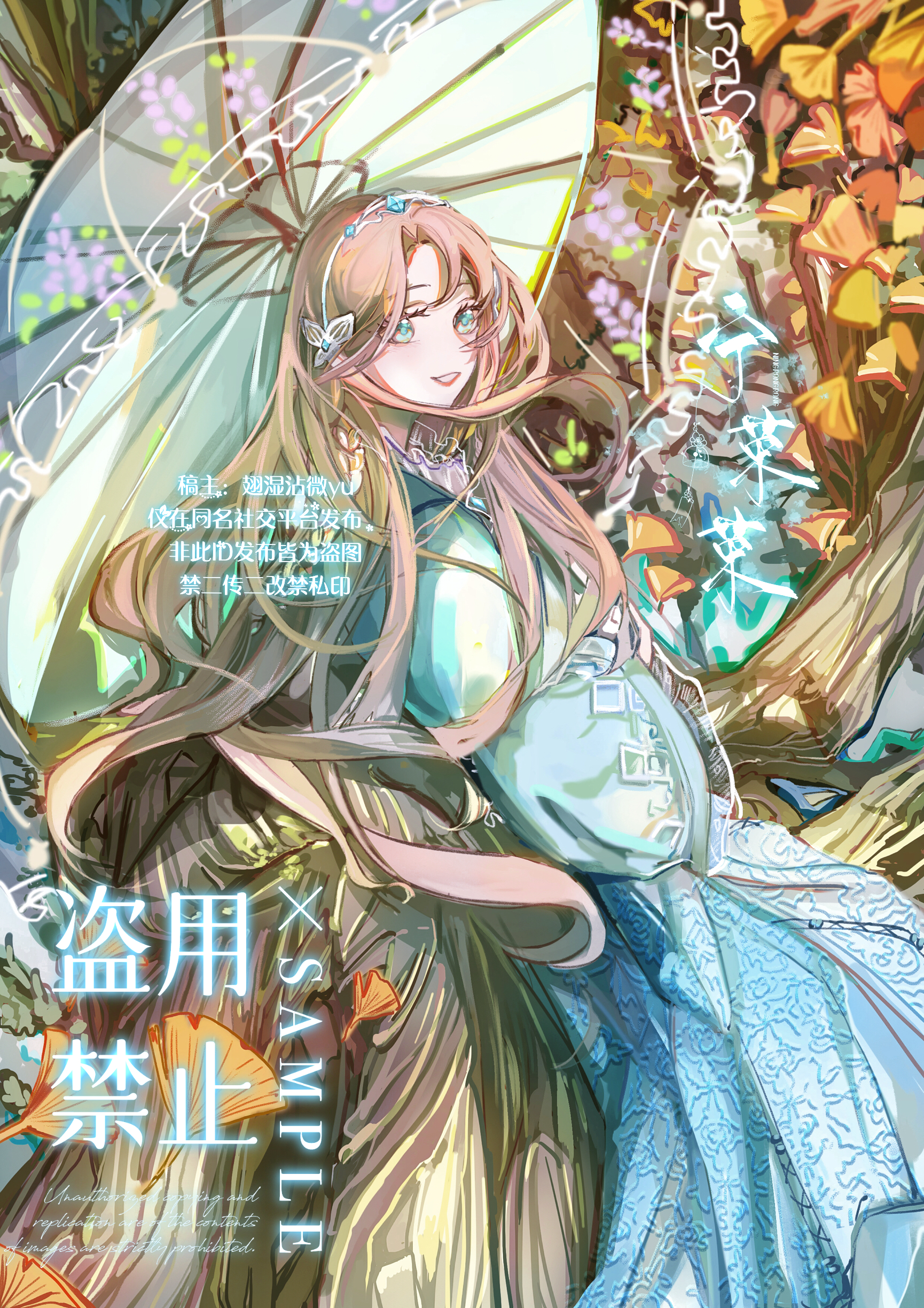 1girl absurdres blue_dress braid brown_hair douluo_dalu dress from_side hairband highres holding holding_umbrella leaf long_hair long_sleeves ning_rongrong_(douluo_dalu) open_mouth shi_zengyu_yu_guang solo teeth tree umbrella upper_body