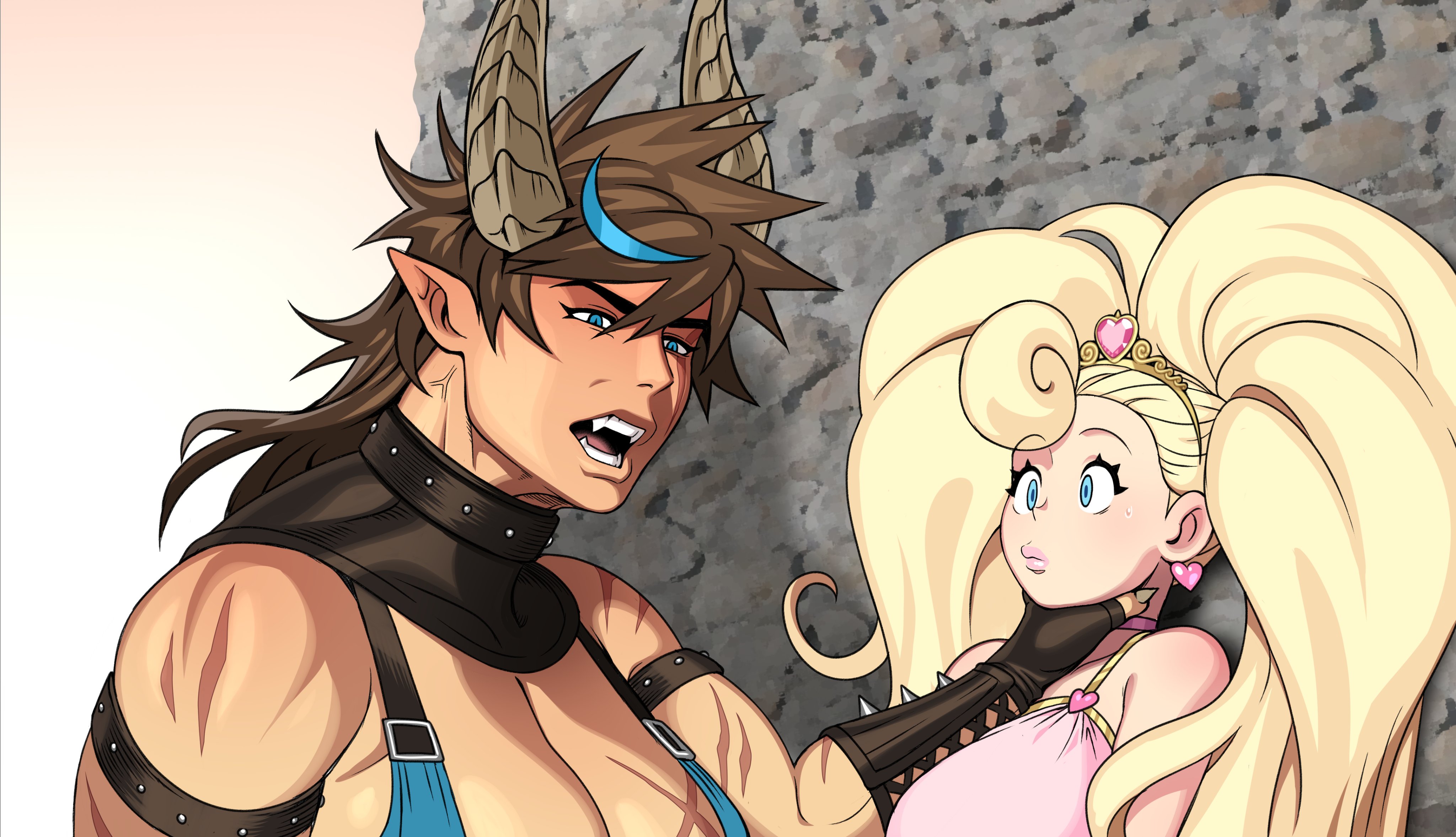 2girls absurdres against_wall assertive_female blonde_hair blue_eyes blue_hair breasts brown_hair cleavage fingernails glitter_and_gold hand_on_another's_neck highres honey_(glitter_and_gold) horns looking_at_another meme multicolored_hair multiple_girls norael norael_(glitter_and_gold) pointy_ears scar scar_on_chest sharp_fingernails streaked_hair tiara