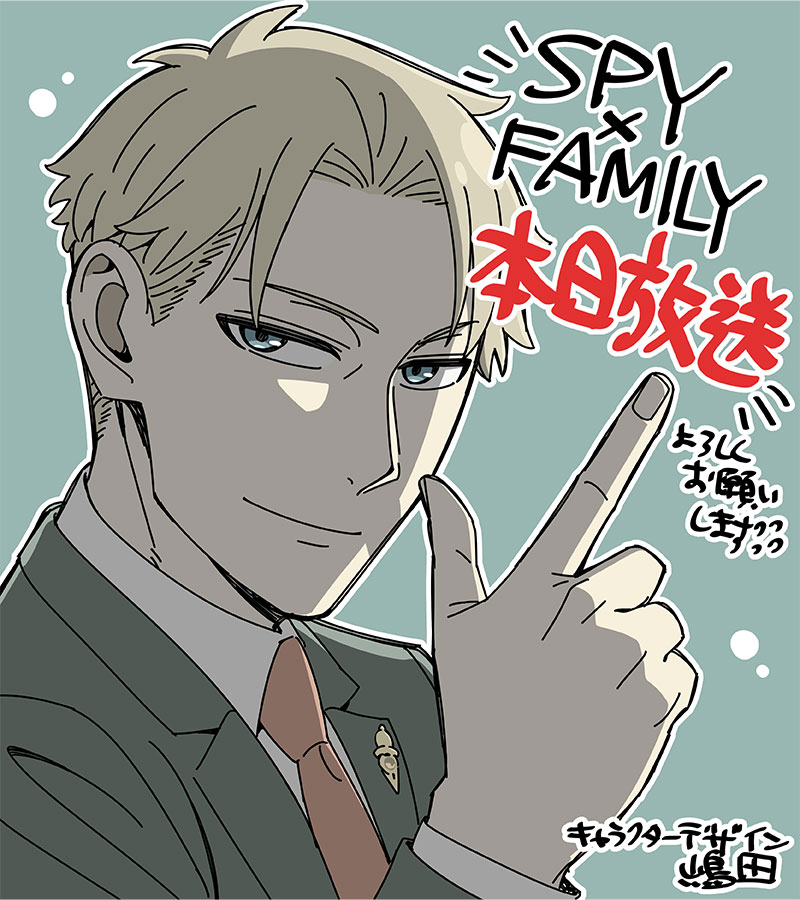 1boy blonde_hair blue_eyes close-up countdown finger_gun formal_clothes green_background green_jacket jacket looking_at_viewer male_focus necktie official_art red_necktie shimada_kazuaki short_hair simple_background smile solo spy_x_family suit twilight_(spy_x_family) upper_body