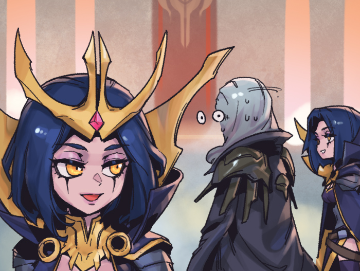 1boy 2girls :d black_jacket black_thighhighs blue_hair breasts disembodied_eye distracted_boyfriend_(meme) dual_persona grey_hair jacket league_of_legends leblanc_(league_of_legends) leblanc_(legacy) long_sleeves looking_back medium_breasts medium_hair meme multiple_girls open_mouth phantom_cross smile swain_(league_of_legends) thighhighs