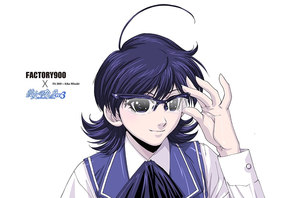 1girl adjusting_eyewear ahoge ascot blue_ascot blue_eyes blue_hair blue_vest character_name collared_shirt copyright_name glasses hand_on_eyewear kanojo_no_carrera kanojo_no_carrera_gt3 kikuchi_michitaka logo looking_at_viewer misaki_aika official_art portrait shirt smile solo vest white_background white_shirt