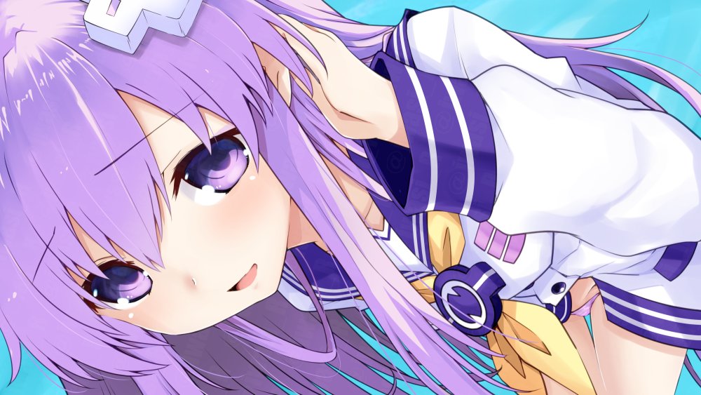 blue_background breasts collar hair_ornament hairclip happy iwashi_dorobou_-r- long_hair nepgear neptune_(series) open_mouth panties purple_eyes purple_hair ribbon shirt simple_background small_breasts striped_clothes striped_panties underwear
