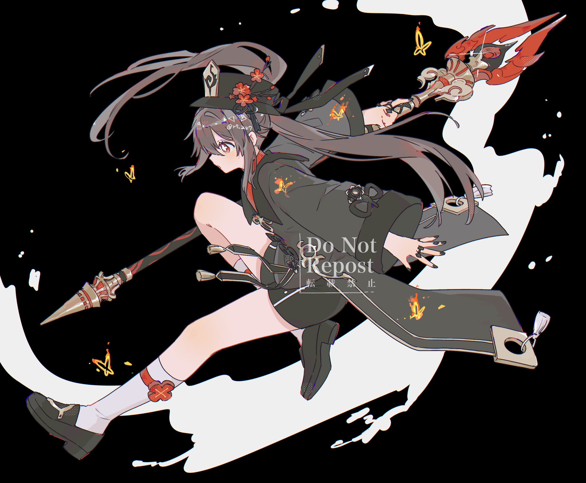 1girl black_background black_hat black_nails black_shoes black_shorts brown_hair bug butterfly coat coattails collared_coat collared_shirt commentary fire flower flower-shaped_pupils genshin_impact hat hat_flower hat_ornament highres hu_tao_(genshin_impact) insect long_hair nail_polish open_mouth plum_blossoms porkpie_hat red_eyes red_flower red_shirt shirt shoes shorts socks solo sparkle staff_of_homa_(genshin_impact) symbol-shaped_pupils tailcoat talisman tassel twintails very_long_hair white_socks yayoripain