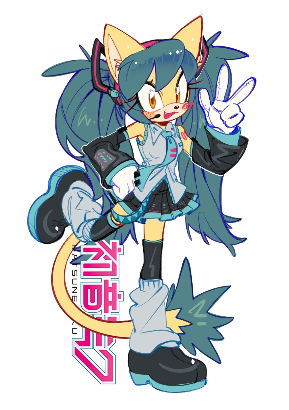 1girl 3mia_hadi3 :3 black_boots black_skirt black_sleeves black_thighhighs blue_hair blush boots cat_girl commentary cosplay detached_sleeves english_commentary fang full_body furry furry_female gloves grey_shirt hatsune_miku hatsune_miku_(cosplay) headset highres honey_the_cat leg_warmers long_sleeves looking_at_viewer microphone shirt simple_background skirt solo sonic_(series) thigh_boots thighhighs twintails vocaloid w white_background white_gloves white_leg_warmers yellow_eyes