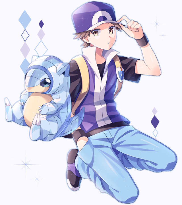 1boy alolan_form alolan_sandshrew alternate_color backpack bag blue_pants brown_eyes brown_hair commentary_request diamond_(shape) gen_7_pokemon hand_in_pocket hand_on_headwear hat jacket looking_at_viewer nintendo pants pokemon pokemon_(creature) pokemon_frlg purple_headwear purple_jacket red_(pokemon) scbstella shirt shoes short_hair short_sleeves sleeveless sleeveless_jacket vs_seeker white_background wristband yellow_bag