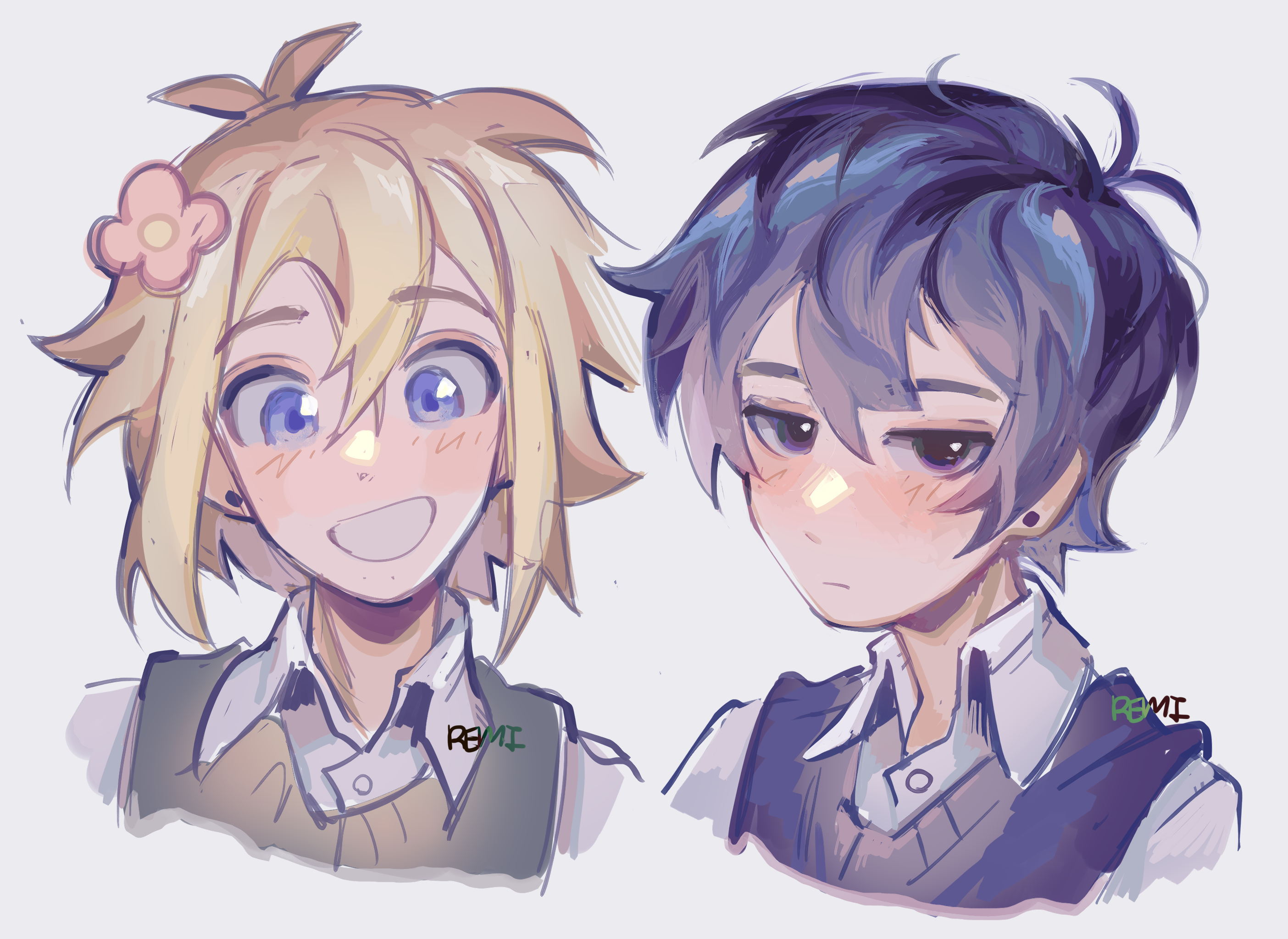 2boys artist_name basil_(faraway)_(omori) basil_(omori) black_eyes black_hair black_sweater_vest blonde_hair blue_eyes blush closed_mouth collared_shirt earrings expressionless flower green_sweater_vest hair_flower hair_ornament highres jewelry multiple_boys omori parted_lips remi_(mozzaremi) shirt short_hair simple_background smile stud_earrings sunny_(omori) sweater_vest teeth white_background white_shirt
