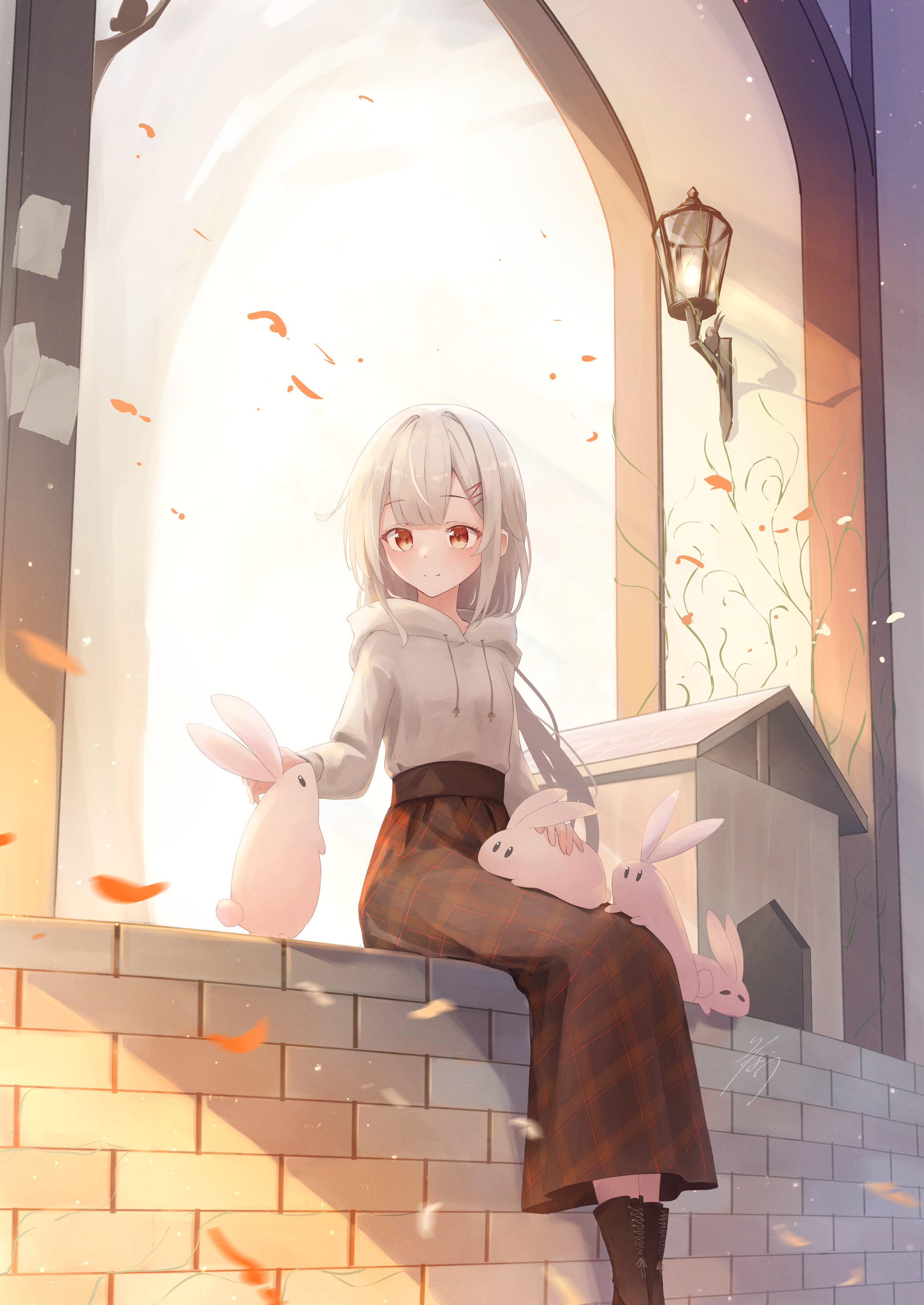 1girl absurdres animal animal_on_lap black_boots black_skirt boots brown_eyes closed_mouth commentary_request drawstring feet_out_of_frame hair_ornament hairclip highres hood hood_down hoodie long_sleeves minau37 on_lap original petals plaid_clothes plaid_skirt rabbit sitting skirt smile solo wall_lamp white_hoodie