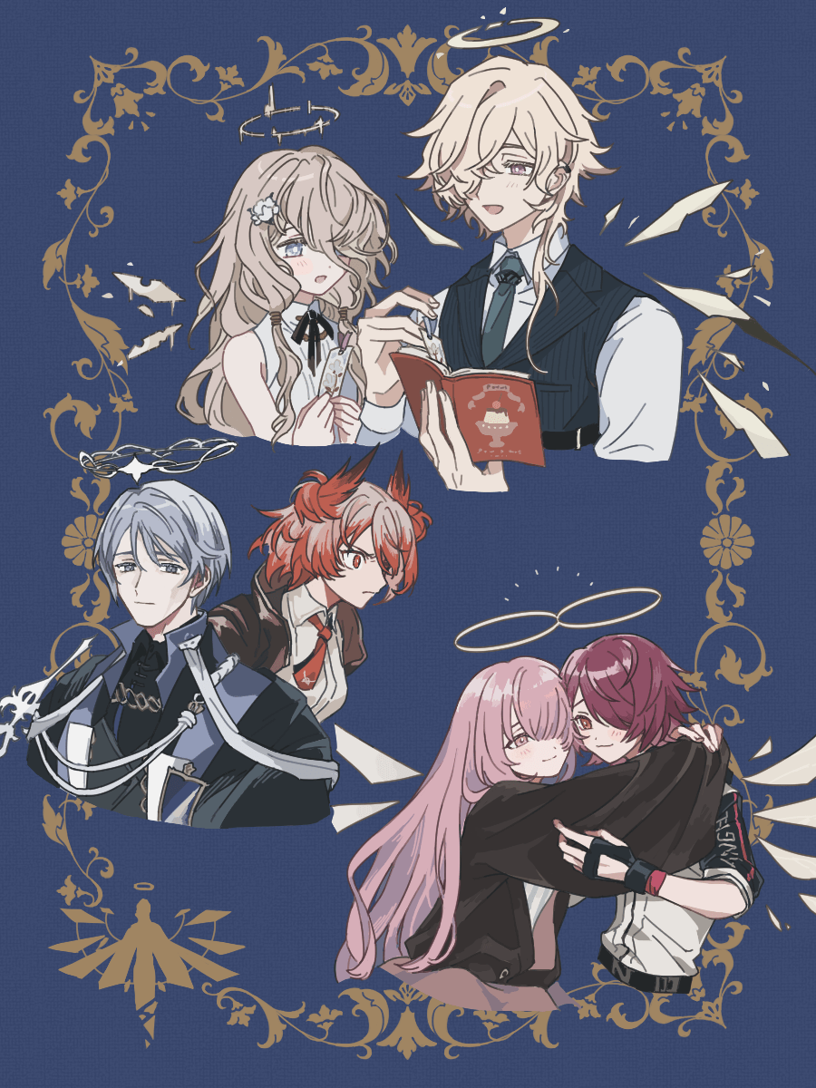 2boys 4girls arknights bare_shoulders black_gloves black_jacket black_necktie black_vest blue_background book cecelia_(arknights) closed_mouth collared_shirt commentary cropped_torso detached_wings dress enforcer_(arknights) executor_(arknights) exusiai_(arknights) fiammetta_(arknights) fingerless_gloves gloves hair_over_one_eye halo highres holding holding_book hug jacket lemuen_(arknights) long_hair long_sleeves multiple_boys multiple_girls necktie open_book pink_hair red_eyes red_hair shirt simple_background sirakaro sleeveless sleeveless_shirt striped_clothes striped_vest untranslatable_commentary upper_body v-shaped_eyebrows vertical-striped_clothes vertical-striped_vest very_long_hair vest white_dress white_jacket white_shirt white_wings wide_sleeves wings